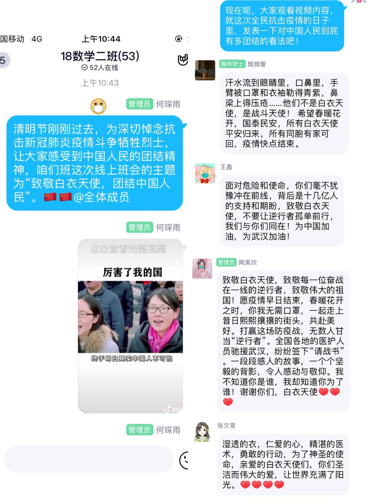 为深切悼念抗击新冠肺炎疫情斗争牺牲烈士,让同学们感受到中国人民的团结精神,4月6日,2018级数学与应用数学2班成功举办“致敬白衣天使,团结中国人民”线上主题班会,由宣传委员何琛雨主持,全体同学们参加。 班会伊始,班委带领同学们讨论了在全民抗击疫情的日子里,中国人到底可以团结到什么程度?有的同学引用英国教授马丁博士的话说,中国人最可怕的就是把团结克在了骨子里。最能体现这一点的是在今天的春节,全国人民说隔离就隔离,不走亲、不串门、不给国家添麻烦,说带口罩一句怨言都没有。隔行如隔山的汽车电器品牌纷纷转行生产口罩,说建医院24小时不停歇。作为大学生的我们,也紧听学院的号召,停课不停学,在家正常学习。最令人心疼的白衣天使们,有的为了抢时间救护病人,自己穿上了成人纸尿裤;为避免交叉感染,女护士剪掉美丽的长发,剃成光头;还有的鼻梁被口罩和护目镜磨出了血,着实令人泪目、心疼。我班同学纷纷表示虽然白衣天使被口罩印痕标记,仍挡不住医者之美,他们坚毅的目光,依然透射着必胜的光芒;从他们身上我们体会到了“以我所学,尽我全力,与时间赛跑,与死神抢人”的必胜精神! 此次班会的成功开展,让同学们体会到不是所有国家的人民都能为同一个目标而努力奋斗,这是我们国家的本能却被全世界羡慕。中国人的本能是明知山有虎偏向虎山行的奉献,是万众一心、风雨同舟的温暖。我们应该弘扬这种中国精神,将团结永远传承!