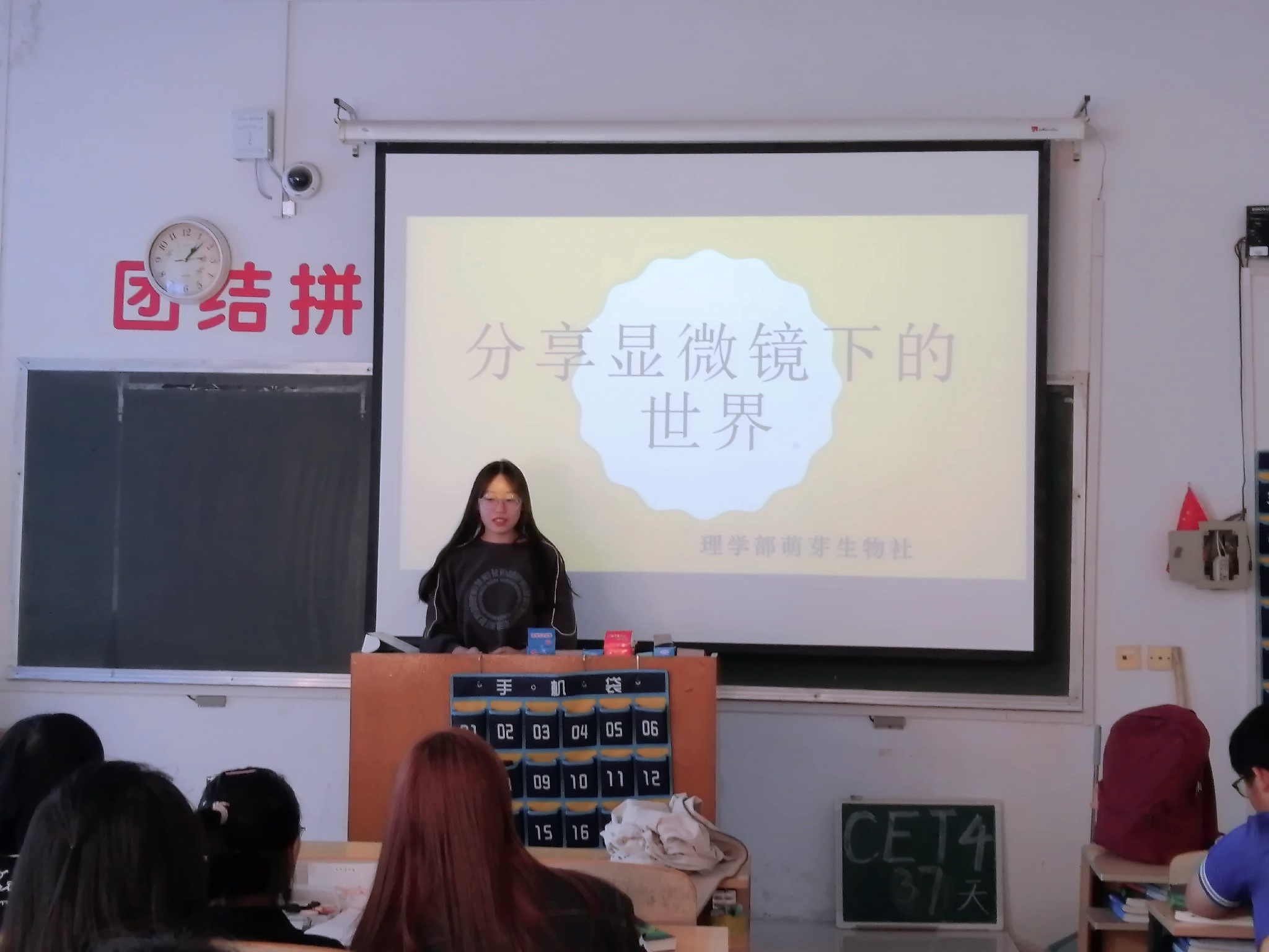 新的学期已经过半,同学们已经能够初步熟悉实验室及显微镜的使用,为进一步巩固所学知识,领略显微镜下的奇妙世界,萌芽生物社于2020年11月7日在第二教学楼311教室举办了了以“分享下微镜下的世界”为主题的学术交流活动。 显微镜不只是科学研究的好伙伴,通过它,我们也得以目睹微观世界惊艳的一面。活动前期,社长组织社员收集整理显微镜观察生物的图片,认真筛选整理知识,并编辑为图片的形式,全体成员提前熟悉活动具体内容。在活动当天,同学们轮流分享自己的图片或视频进行交流学习,巩固学习过的细胞或结构的基本特征,并对疫情结束后想要走进实验室的学习进行展望,确立初步目标。 本次活动的圆满结束提高了同学们的专业能力以及专业素养,在以后的学习中有更明确的目标,也进一步加深了同学之间的感情,对微观世界有了更深的认识。 |