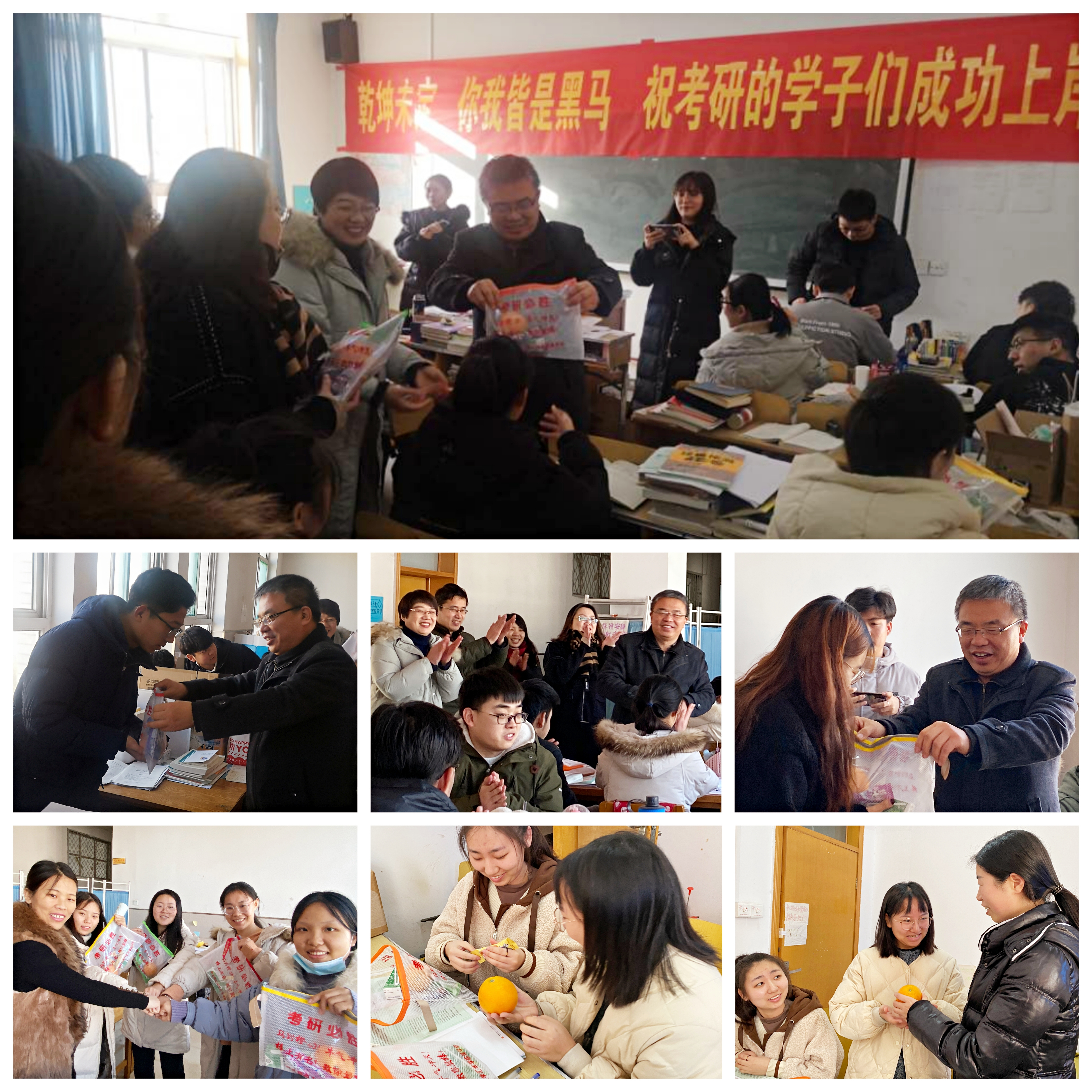 12月15日,学院党委书记徐国强、理学部部长王薇、副部长王玲平、郭绍福以及全体毕业班辅导员深入理学部第二教学楼考研自习室,为2017级即将考研的同学们在寒冷的冬日里送上温暖,并祝福考研学子旗开得胜,榜上有名。 考研将至,学部准备礼物的过程饱含了领导和老师对考研学子的深深祝福,老师们精心挑选的棒棒糖、牛奶和橙子,祝福同学们考试倍“棒”、“牛”气冲天、马到“橙”功。12月15日上午徐国强一行深入考研自习室,慰问考研学生,发放考研加油包,为同学们加油鼓劲,并与同学们进行深入交流。同时,毕业班辅导员深入宿舍为考研学生送上考研加油包,在寒冷的冬日为同学们送上了暖心的祝福。在考研冲刺最后阶段,收到这独具匠心的祝福,学生们激动无比,纷纷把礼物晒到了朋友圈,表达自己的兴奋与喜悦。 近年来,理学部以“严格管理,夯实学业基础;线上线下齐发力,榜样力量引领方向;全员发力,助力学生成长;暖心祝福,考前激励鼓劲”为整体思路,助力学生考研。 严格管理夯实基础 理学部制定学风建设实施方案,将学风建设作为学生教育、管理工作的出发点和落脚点,通过学生干部带动,形式丰富的活动等为抓手,激发学生学习兴趣,使学风建设的重要性真正入脑、入心。在不断探索中,逐步形成了第二课堂“五大工程”育人体系,为提高学生专业能力和核心竞争力提供保障。 榜样力量引领方向 理学部在不同时间段开展了多层次榜样力量、优秀校友回母校巡讲活动。入学初,邀请优秀在读研究生向全体新生分享经验:如何度过一个充实大学生活,合理规划考研。各专业优秀博士校友回母校讲述自己的汇华情节、汇华故事,以及现在的工作生活情况,让学生们看到了未来和希望,明晰自己奋斗的方向。疫情期间“线上考研交流会”在钉钉平台如期举行,各专业邀请考研成功的2020届毕业生讲授“考研经验”,解析考研动态,提振考研信心。 全员发力助力学生成长 为帮助同学们正确调整考研心理,以良好的心态参加考试,理学部教工党支部党员开展志愿服务活动——“考研帮帮团”,各专业教师定期在第二教学楼会议室为广大考研同学辅导答疑。同时,学部党总支组织教工党员对考研同学们进行心理调适,疏解心理压力,助力考研成功。 一直以来,理学部以促进学风,助力考研为主要工作重心,在生活、心理和学习各方面多措并举,为考研学子们不断拓展学习空间,开展专业辅导,调适考前心理,全方位护航同学们考取优异的成绩,考上理想的院校。