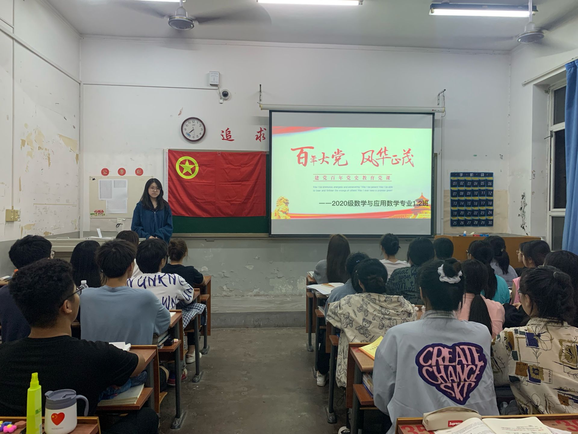 为庆祝中国共产党成立一百周年,进一步了解党的发展历程,学习党的精神,加强党的思想理论建设,2020级数学与应用数学专业于9月17日在114教室顺利开展“百年大党,风华正茂”主题团日活动。 活动伊始,数学1班团支书冯蕊带领全体同学重温入团誓词,让同学们再次接受思想洗礼,坚定了同学们不忘初心牢记使命、与时代主题同心同向的信念。随后,数学2班团支书郭苗堉以PPT演讲的方式分别从新民主主义革命时期、社会主义革命时期和建设时期、改革开放和社会主义现代化建设时期、中国特色社会主义新时代四个时期对党史发展历程进行了详细介绍。最后,辅导员老师李仲玲就积极学习党史、弘扬五四精神同勤学业、爱国家紧密结合起来,鼓励同学们争做社会主义优秀青年。 百年征程波澜壮阔,百年初心历久弥坚。本次活动的顺利进行,使同学们进一步加强了对改革开放的认识,懂得身为新时代青年应不忘初心牢记使命、有理想、有担当,把自己全部的青春与热血播撒在华夏大地,书写出祖国更加美好的明天。