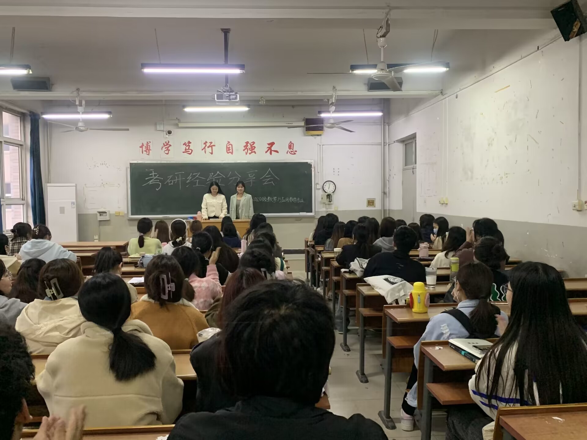 为深入贯彻学院人才培养理念,深入了解考研具体信息及备考方法,2020级数学与应用数学专业于4月25日在第二教学楼205教室开展考研交流会。特别邀请今年考研成功的2019级数学专业学生刘丹宁和陈佳璇介绍她们的考研经历及学习经验。