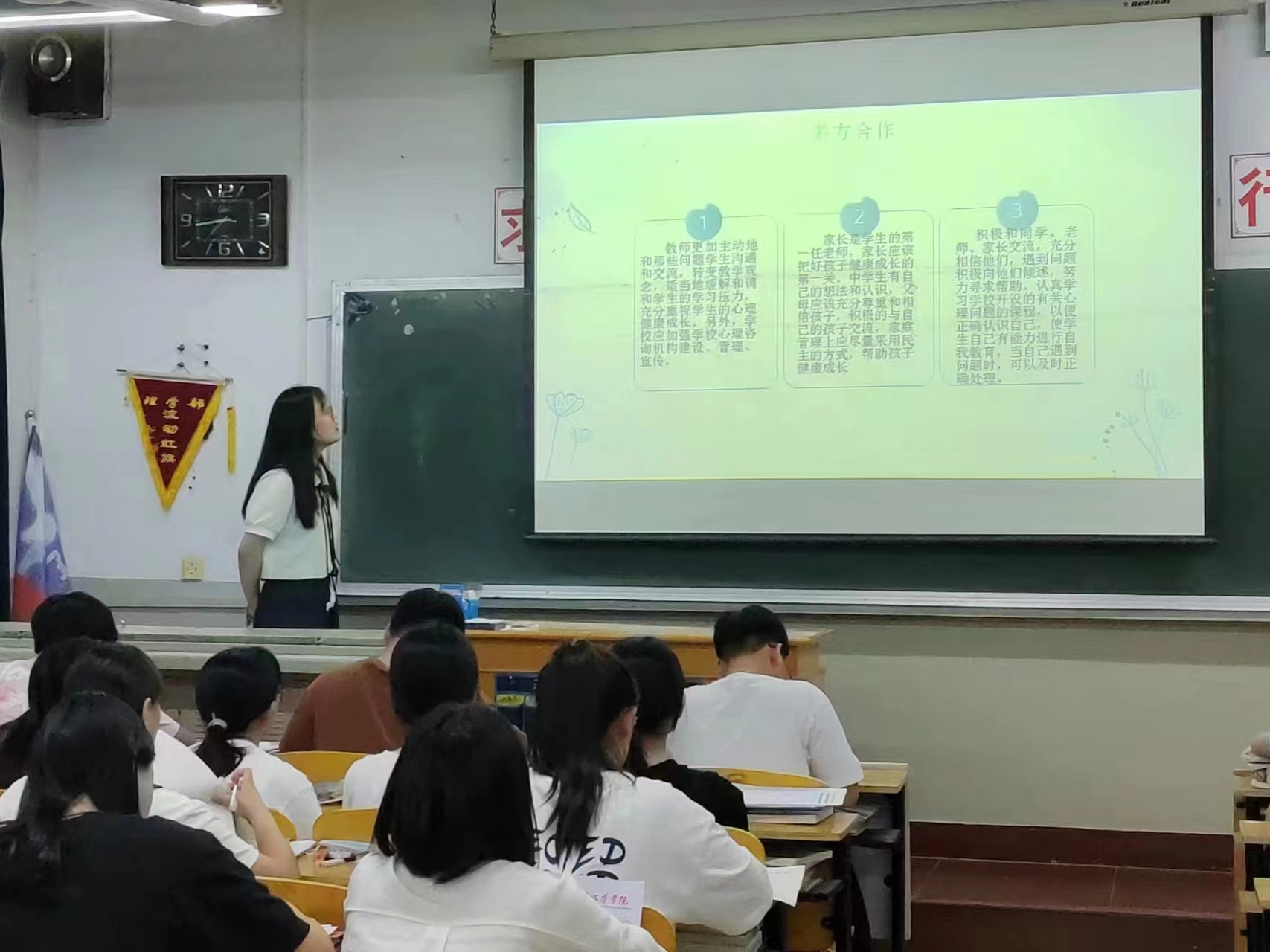 团支部书记王慧分别从自我保护、自我调节、互相帮助、热爱生命四个方面进行安全教育讲解。第一部分,结合身边发生的具体事例,讲述安全防范的重要性并讲解了如何防范意外情况的发生,提高了同学们的自我保护意识;第二部分,通过列举社会反例,讲述了情绪失控带来的不良影响以及引起情绪失控的几种因素,提出了调节情绪的几种方法,呼吁同学们做情绪的主人;第三部分,鼓励同学们进行交流,向老师、家长、同学倾诉遇到的问题与心事,提醒同学们遇到问题要及时沟通并寻求帮助;第四部分,通过阅读汪国真的诗歌《热爱生命》,同学们认识到了生命的珍贵,强调了安全的重要性,切实提高了同学们的安全防范意识。 本次安全教育主题班会有效增强了同学们的安全意识,牢固树立了“安全第一”的思想,增强了自我防范意识,为同学们敲响了安全的警钟。 |