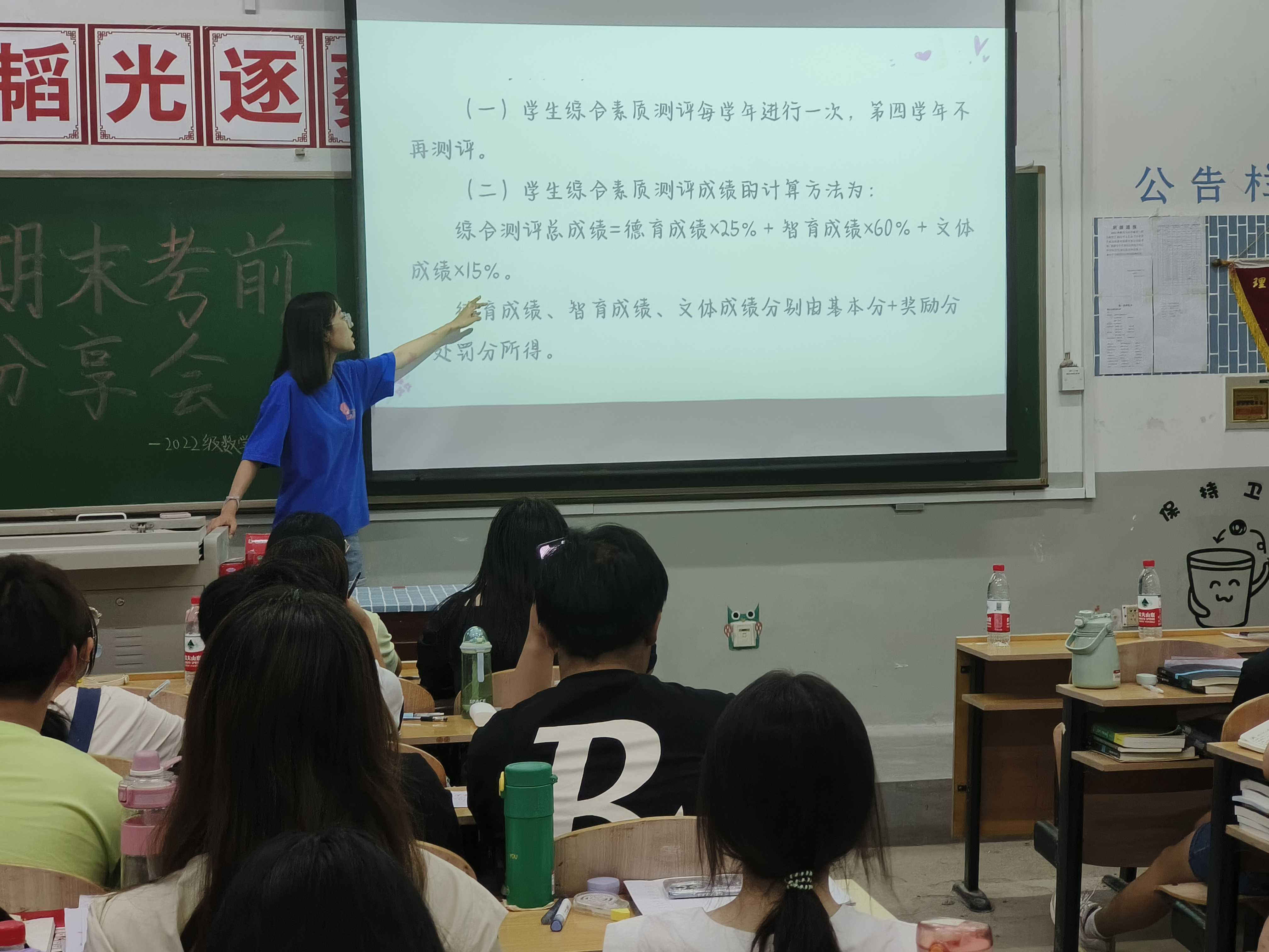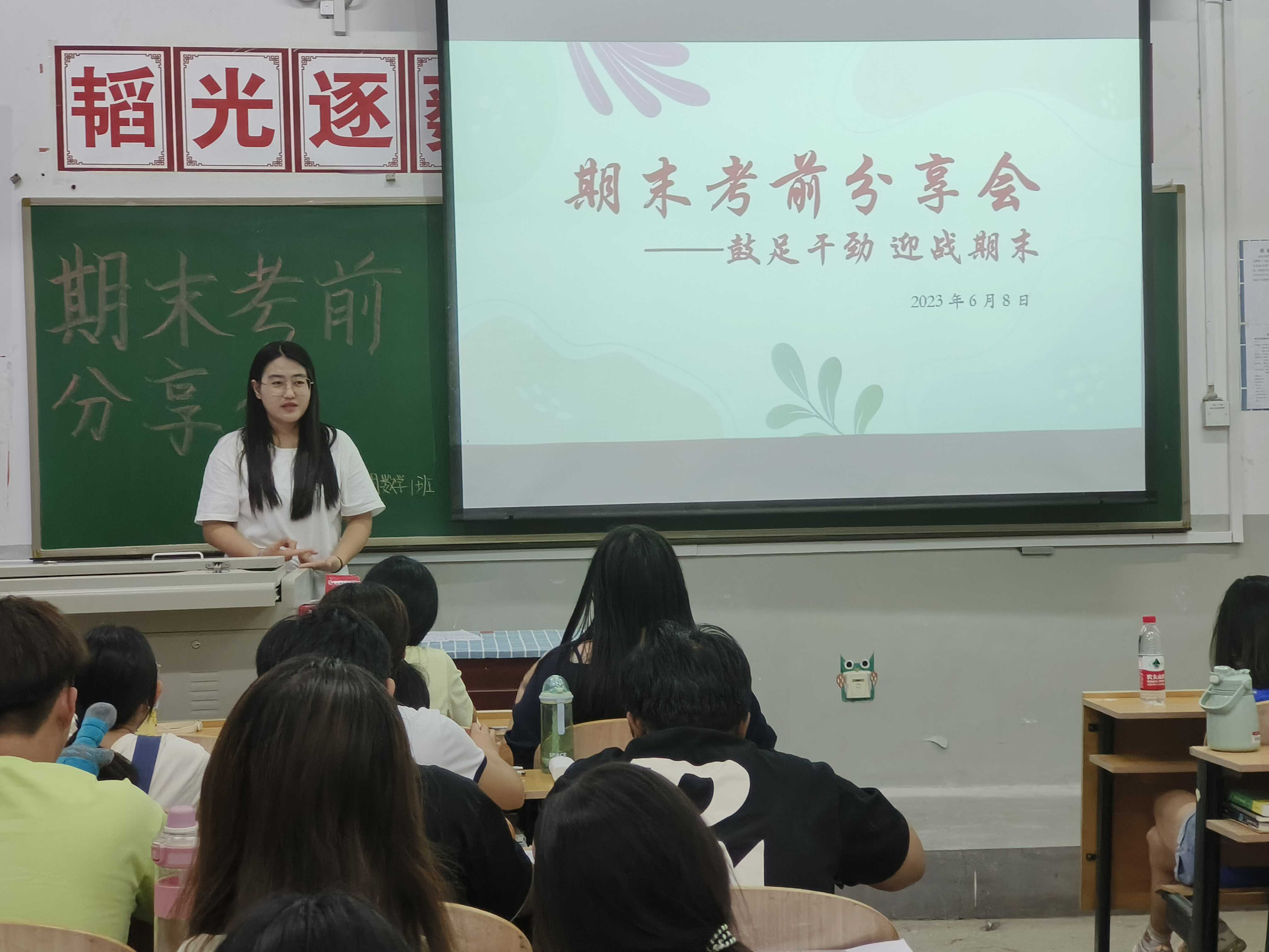 为了帮助本班同学以正确的态度对待期末考试,明确备考方向,2022级数学与应用数学1班于2023年6月8日在第二教学楼113教室开展期末考前分享会。