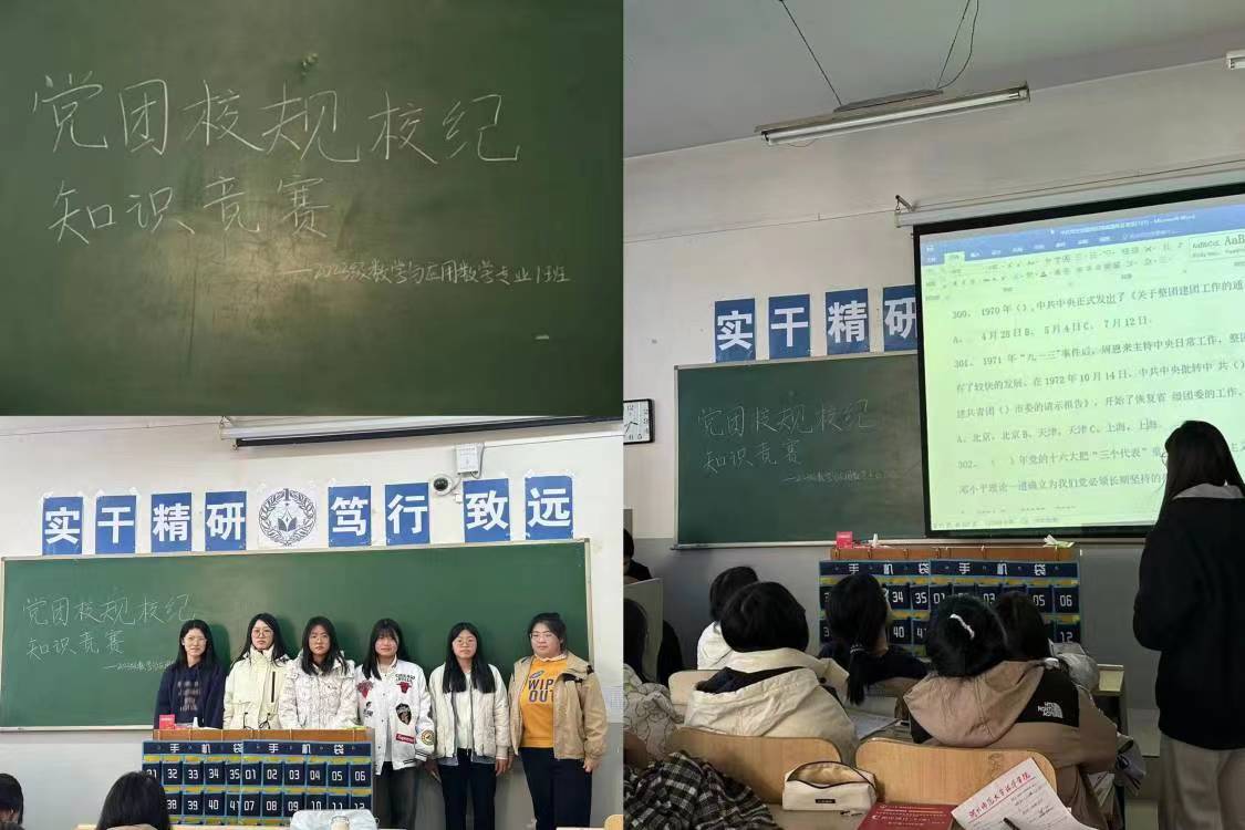 为了使同学们对党团校规校纪的了解更加全面,充实同学们的校园生活,担负起千年文化传承责任,推动中华优秀传统文化创造性转化,创新性发展,2023级数学与应用数学1班于2023年11月16日在第二教学楼四层401教室开展了以“党团校规校纪”为主题的人文知识竞赛。 此次竞赛以党团知识为核心,普及党团知识,激励大家学习党团知识,传承历史经典,孕育文化底蕴,建设书香班级。此次活动将同学们分为三个组,首先每组同学们内部PK, 一共进行了三轮,最后获胜的两名同学进入最终的决赛。在比赛中,同学们积极表现自己,对于评委提出的问题对答如流,可见同学们对这次知识竞赛的重视度!在激烈的氛围衬托下,此次党团校规校纪知识竞赛也落下了帷幕。最后在评委公平、公正、公开、透明地计分下,一共选出来了六名同学获胜,这六名同学也会获得丰厚的奖励。 参加党团校规校纪知识竞赛,锻炼大脑,拓展视野,知识竞赛不仅是一项竞赛活动,更是一种锻炼大脑和拓展视野的机会。这种竞赛让同学们了解到丰富多彩的人文知识,每个领域都令同学们深感兴趣。参加这样的竞赛活动不仅能够提高同学们的知识水平和记忆力,同时也能够增进同学们对党团校规校纪知识的理解和欣赏。