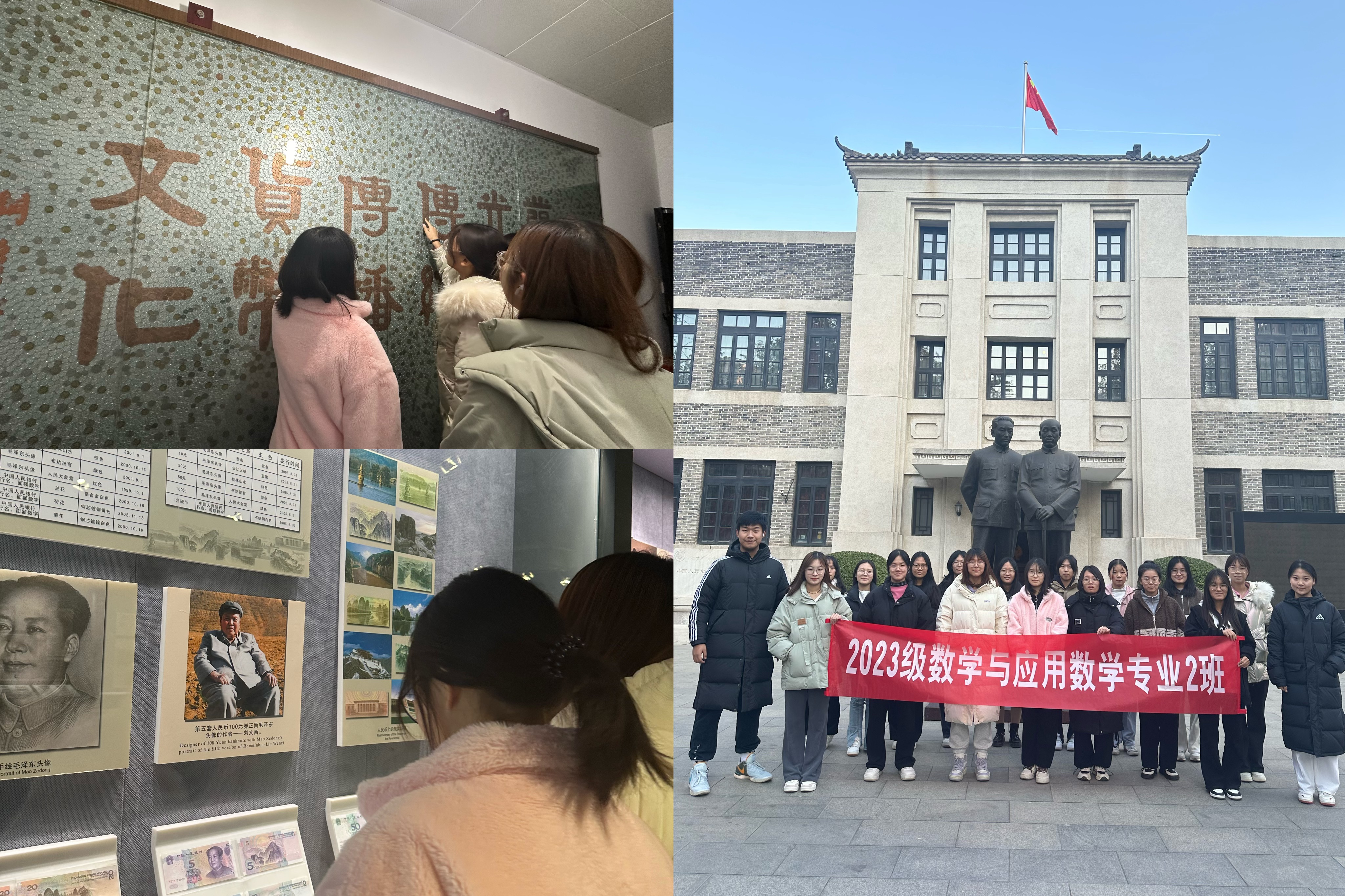 为了传承红色文化,增强同学们对货币渊源的认识,开阔他们的见识并提升综合素质,2023级数学与应用数学2班的同学们在2023年12月7日下午2:30至3:30赴河北钱币博物馆开展“穿越古今货币之旅”主题活动。 在河北钱币博物馆中,同学们分别参观了红色货币记忆、人民币发展史、河北历史货币及临时展馆等展厅。红色货币记忆展厅中收藏了大量解放前各人民政权发行的人民政权货币或根据地解放区货币,同学们被“星点烽火成燎原之势”“席卷千军山河一片红”等言语深深触动;在人民币发展史展厅中,同学们了解到中国人民银行陆续发行了五套人民币,包括纸币、流通金属币、普通纪念币等不同种类的人民币,里面介绍了第五套人民币(2005版)各元券的防伪点详细说明,它的发行标志着我国印钞造币技术跨上了一个崭新的台阶;河北历史货币展厅中收藏了从先秦时期开始的,在河北境内铸造或者流通过的古钱币,其中,以在石家庄市灵寿和平山出土的战国时期古中山国文物金贝和银贝最有珍贵,成为该馆的镇馆之宝。这些珍贵的展品展示了中国货币的发展历程,从古代的实物货币到现代的纸币,让同学们深刻感受到货币在人类社会发展中的重要地位。