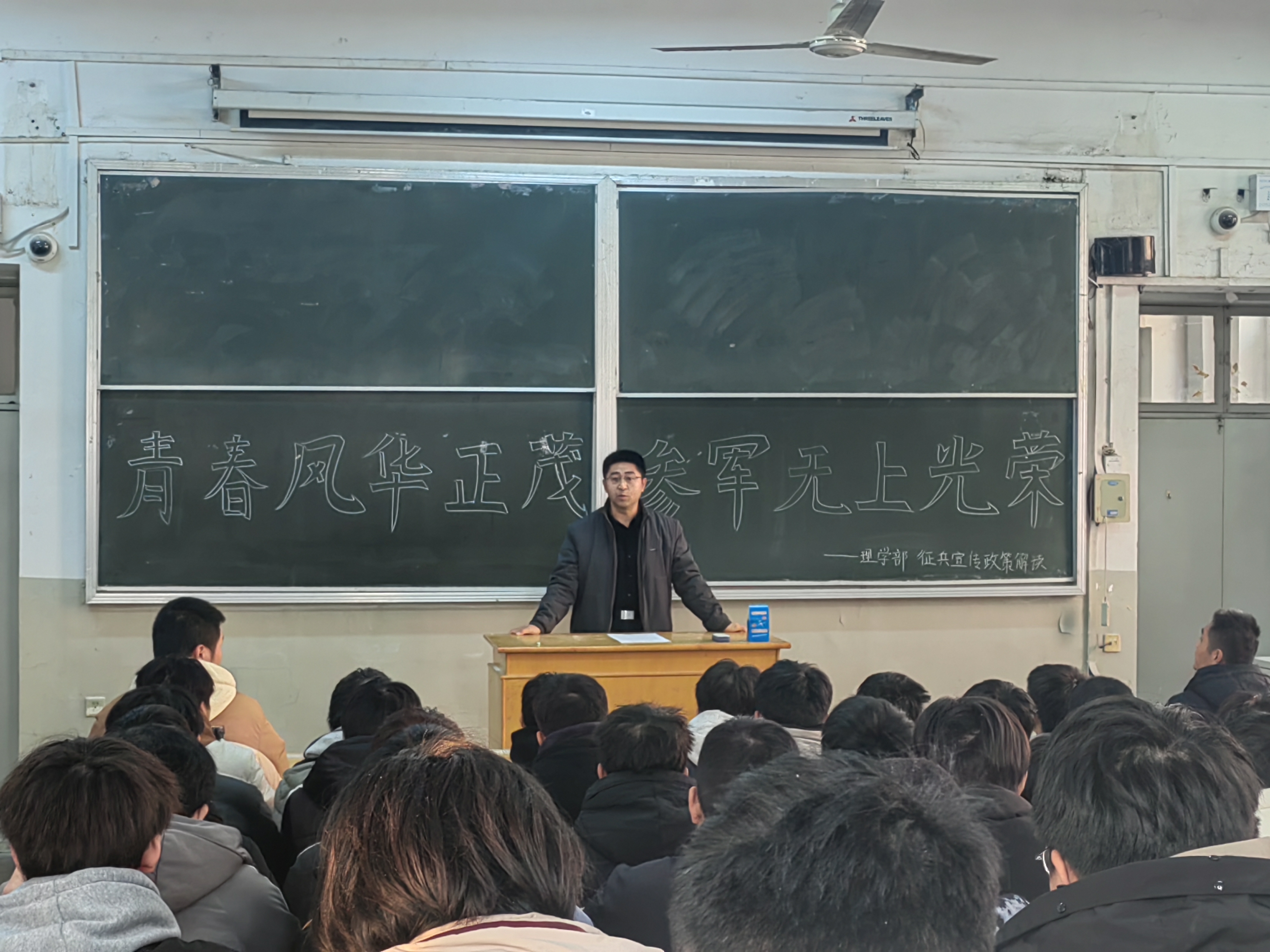 理学部高度重视大学生征兵工作,充分调动校内外育人力量,为响应国家和党的号召,推进国防教育,深入学习领会习近平强军思想,同时鼓励青年学子积极从戎报国、应征入伍。理学部邀请石家庄警备区司海涛科长于12月28日在第二教学楼204教室进行2024年征兵政策宣讲,毕业生辅导员安志远、马维涛及2020级、2022级全体男生参加了本次活动。 宣讲会上,司海涛科长首先从国防教育工作的角度强调了征兵工作的重要性,引导同学们要坚定理想信念,树立家国情怀,坚持勇于担当,不断增强国防观念、责任意识、爱国精神,自觉携笔从戎、报效祖国。其次,司海涛科长为参会学生发放征兵宣传资料、播放征兵宣传片,从应征入伍条件、报名流程、参军政策、入伍福利等方面进行了全方位讲解,详细介绍了高校学生参军的各项规定和要求,强化学生服兵役的责任感和参军保卫祖国的意识,号召大家应征入伍、积极参军、保家卫国。随后,司海涛科长根据自己在军旅服役多年的成长经历与参会学生进行征兵宣传答疑活动,同学们争先恐后地提出自己关心的问题,司科长结合同学们的提问,耐心细致地进行解答,为有意向入伍的学生答疑解惑,切实解决了他们的实际问题和减少了顾虑,激发了同学们应征入伍的热情。会后,参会的辅导员老师们从理学部国防教育工作的角度与司海涛科长交流了征兵工作经验,表示扎实的征兵政策宣讲教育是开展国防教育的基础、榜样的宣传是落实工作的重要抓手,双方将会为新时代的热血青年贡献自己的力量。