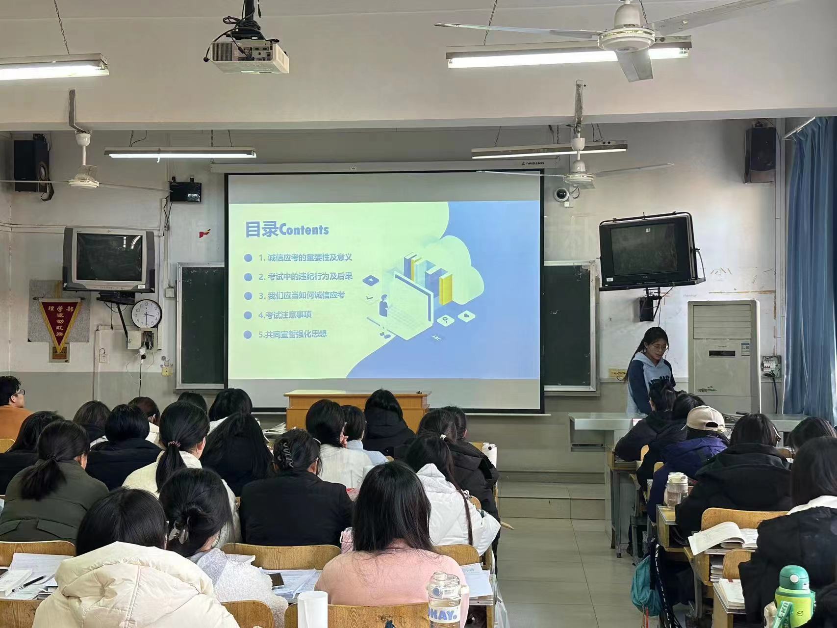 为了更好地迎接期末考试,端正考试态度,严明考场纪律。2023级生物科学专业1班于2024年1月3日在第二教学楼304教室开展“考之以诚,答之以信”主题班会,特邀赵春红老师,辅导员助理郭晓瑞参加。 会议伊始,学习委员张心妍讲解了期末考试的各项流程,使同学们对本次考试的各项安排有了清晰的认知。紧接着,张心妍同学又结合我校真实案例,着重讲述了诚信应考的重要性,使同学们充分了解了考试违纪作弊的惩罚措施。随后班长田瑾飒带领同学们进行诚信应考宣誓,同学们声音洪亮,态度端正,并在纪律委员李雨萌的带领下在考试承诺书上签字。此外,同学们制订了目标书签用以激励自己努力学习,一个个书签展示了他们蟾宫折桂的决心。最后赵春红老师对本次会议作出总结,她提到:“理学部向来以学风优良,纪律严明著称,同学们代表的不仅是自己的班级,更代表了整个理学部,因此,同学们更应严于律己,慎独慎微。”