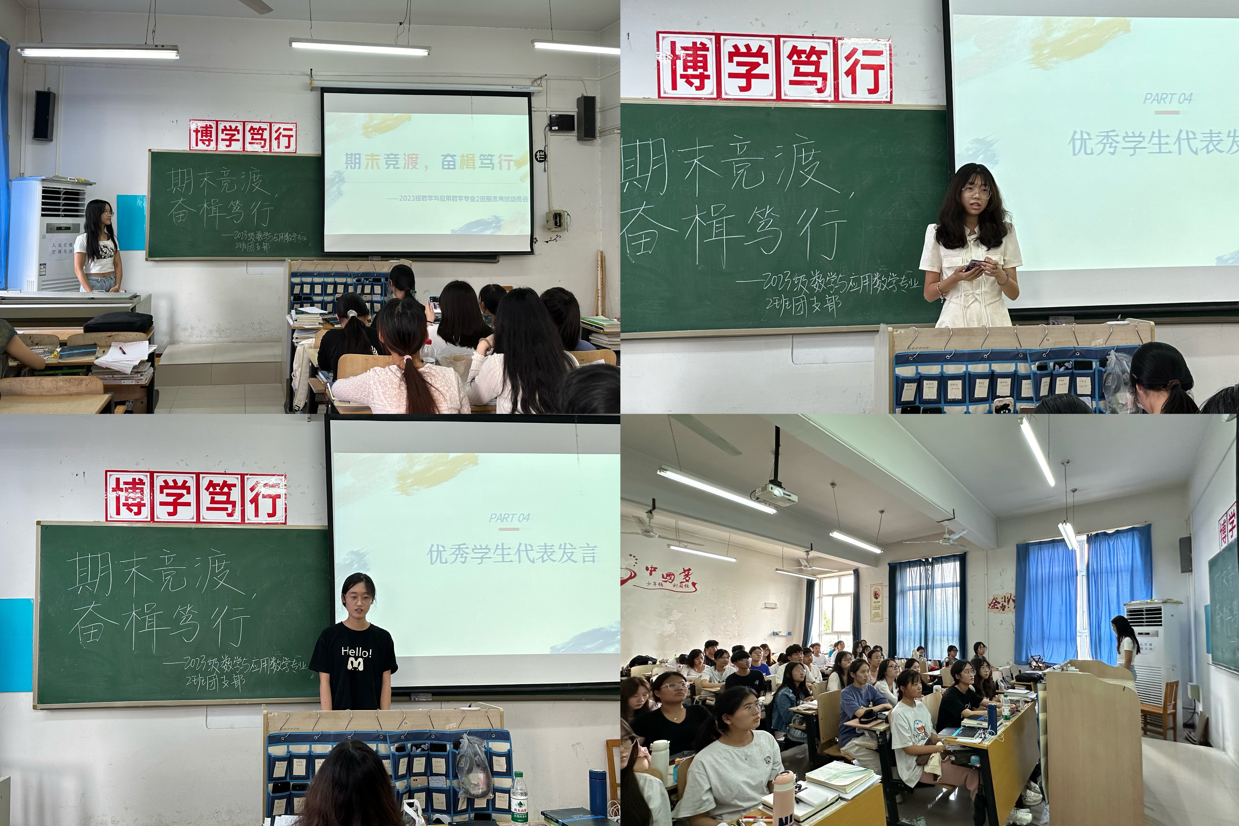 在期末考试临近之际,为了激发同学们的学习热情,提高备考效率,2023级数学与应用数学2班于6月6日下午在二教402教室召开了“期末竞渡,奋楫笃行—期末考试动员会”主题班会。本次班会由学习委员张亿佳主持,全班同学共同参与。 班会伊始,学委张亿佳点明了本次班会的主旨,强调了期末考试的重要性。她指出,期末考试不仅是对同学们本学期学习成果的检验,更是对大家学习态度和意志力的考验。随后,她详细介绍了考试日程安排,让同学们对考试时间有了明确的把握。紧接着,本班优秀学生代表陈佳倩同学和魏嘉同学先后分享了自己的学习经验和复习计划。陈佳倩同学以其扎实的专业基础和高效的学习方法,为同学们提供了宝贵的借鉴,她强调了课堂学习的重要性,鼓励同学们积极参与课堂互动,提高学习效率。魏嘉同学则从复习方法和心态调整两个方面入手,为同学们提供了全面的指导,她建议同学们制定合理的复习计划,注重知识点的梳理和总结,同时保持积极乐观的心态,以应对考试中的各种挑战。最后,学委张亿佳为同学们讲述了应考技巧和注意事项,提醒同学们要认真阅读考试规则,遵守考试纪律,注意答题规范和时间分配。此外,她还鼓励同学们在考试中保持冷静,相信自己的能力,发挥出最佳水平。