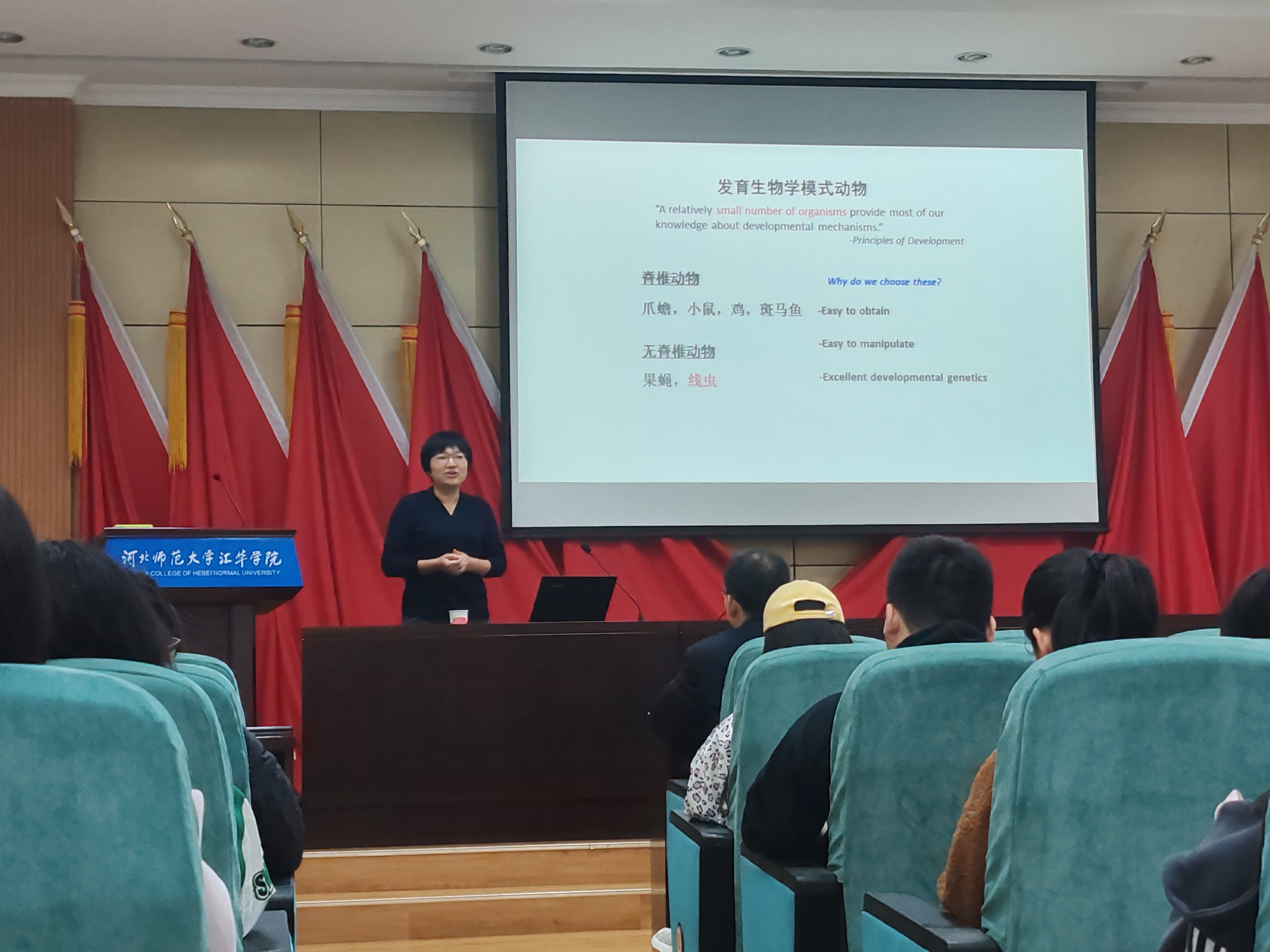 2024年10月27日,中国科学院遗传与发育生物学研究所研究员、博士生导师丁梅做客“汇华名家讲堂”,在图书馆一楼报告厅作题为“发育动物学模式动物”的学术报告。理学部部长张增水主持报告会,理学部教学工作副部长郭绍福、辅导员郭世超以及生物科学专业160余名学生到场聆听。 丁梅在报告中深入浅出地介绍了生物学的多个前沿领域,从专业角度深入讲述了分子发育生物学研究中的模式物种以及分子生物学的发展。通过清晰的逻辑和大量的实例,为大家剖析了分子生物学相关内容,她指出人类的感知、学习、记忆、思维、情绪均依赖于神经系统正确的信号传导,然而神经系统信号传导的 具体发生机制以及确保信息传导连贯性和精确性的机制尚在研究中,她强调了生物学在解决当前人类社会发展问题中的关键作用,并对未来的研究方向提出了自己的见解,同时鼓励年轻学子们投身于生命科学的研究,为人类的可持续发展贡 献智慧和力量。