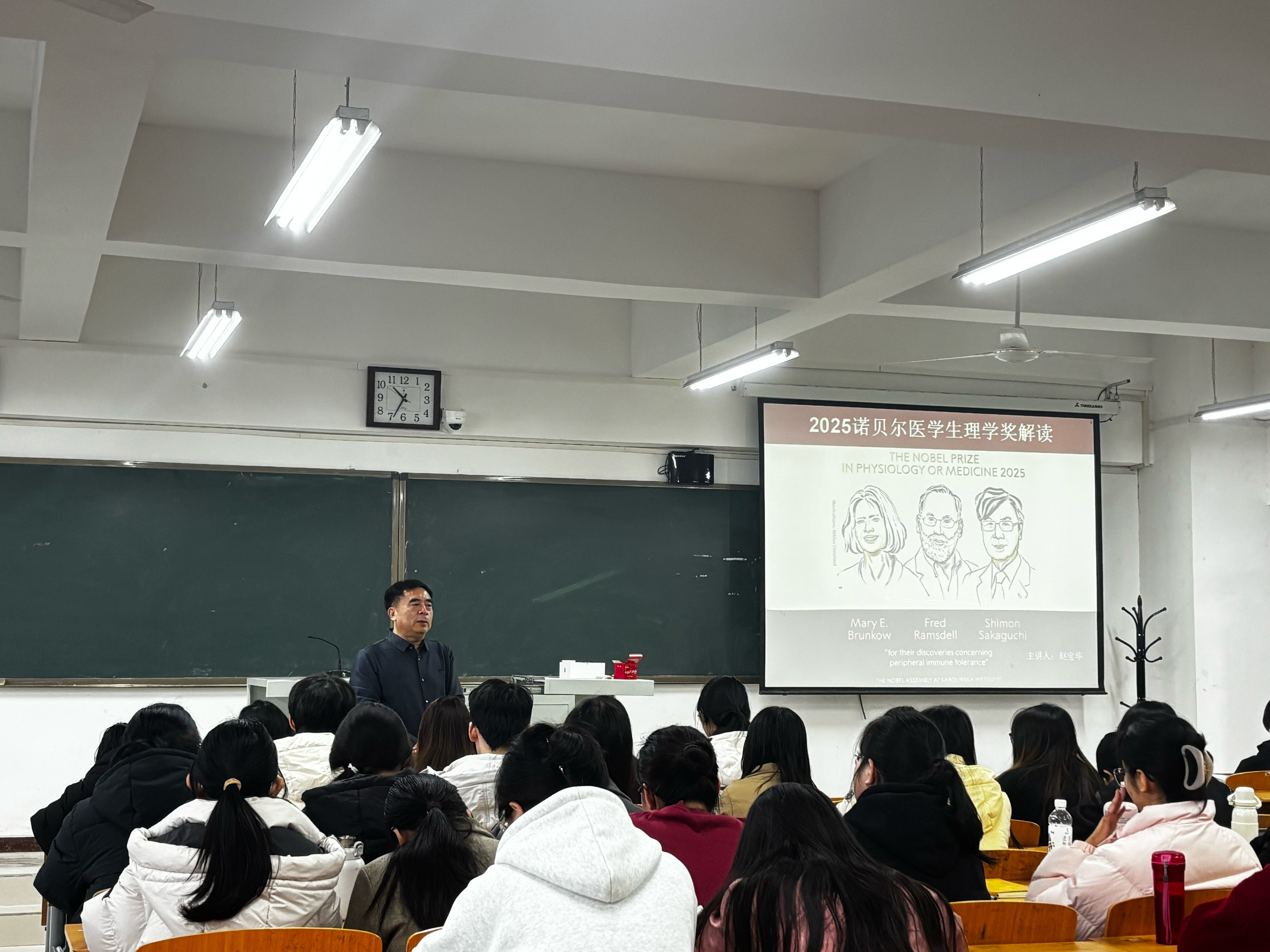 11月7日,Beat365唯一官方网站三级教授、博士研究生导师赵宝华,应邀做客Beat365“汇华名家讲堂”,在第五教学楼404教室作题为“2025年诺贝尔医学生理学奖解读”的学术报告。理学部部长张增水主持讲座,生物科学专业学生到场聆听。 首先,赵宝华教授介绍2025年诺贝尔生理学或医学奖授予的三位科学家:玛丽•布伦科、费雷德•拉姆斯德尔和坂口志文。赵宝华教授指出,三位科学家发现的“免疫系统的保镖—调节性T细胞”让我们从“被动理解免疫耐受”走向“主动调控免疫平衡”。接着,他重点讲解了中枢免疫耐受、外周免疫耐受与Treg细胞的发现,通过例举病例,分析免疫耐受的形成机制与外周免疫耐受的机制。最后,赵宝华教授对免疫耐受的前景进行展望,他强调,科研的真正精神,是在质疑中坚守真理,在孤独中追寻答案,用执着与理性去点亮未知的黑暗!