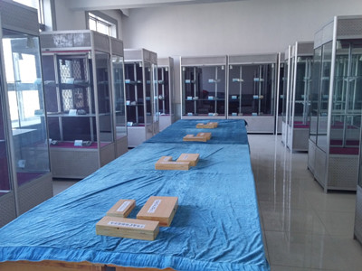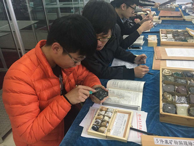 理学部岩矿展览室2015年开始筹建,在学院的大力支持下,经历了校外考察、展览标本选购、手标本对比筛选、展室选择与清扫、标本整理及上架、教学设施补充与完善等工作阶段。展览标本共计123块(套):记有古生物标本27块、单矿物标本40块、岩石标本44块和构造标本8块;矿物光学标本、矿物硬度标本、矿物解理标本、矿物及岩浆岩、沉积岩、变质岩手标本各4套,涵盖主要造岩矿物和分布广泛的岩石类型。