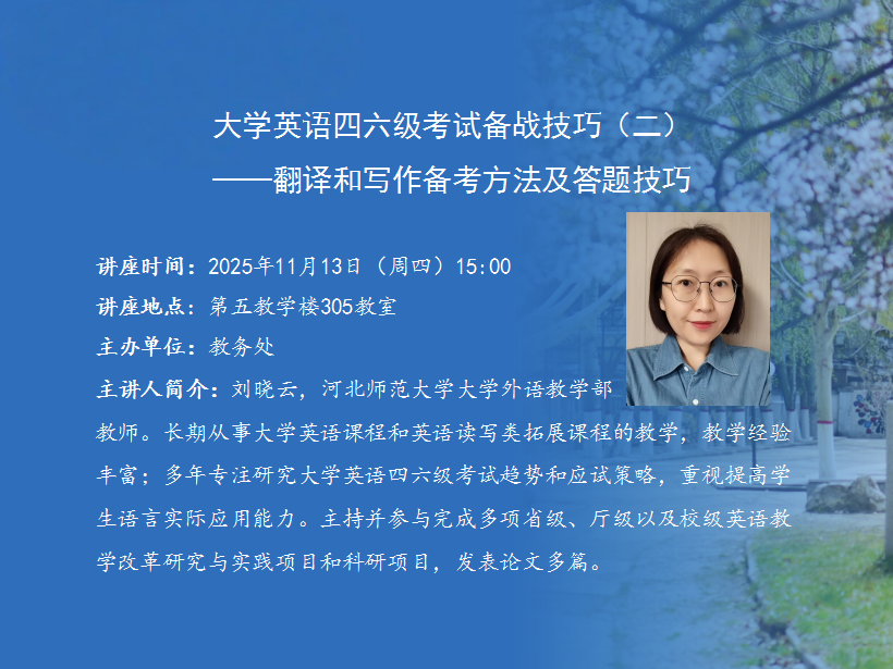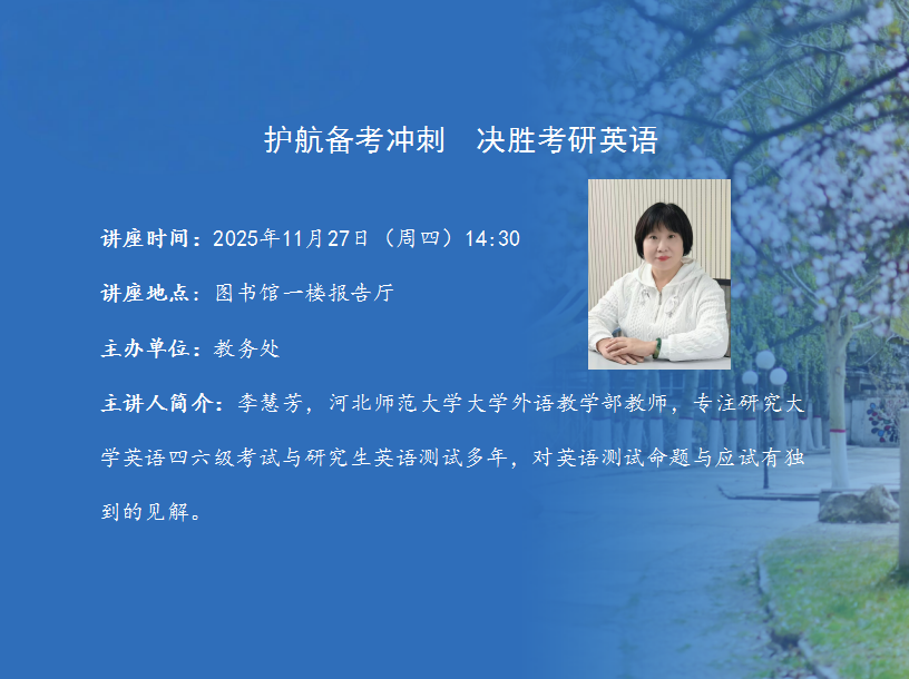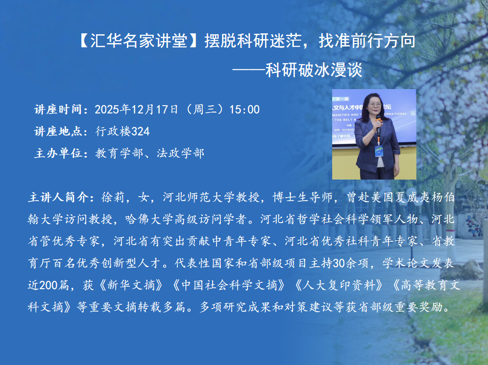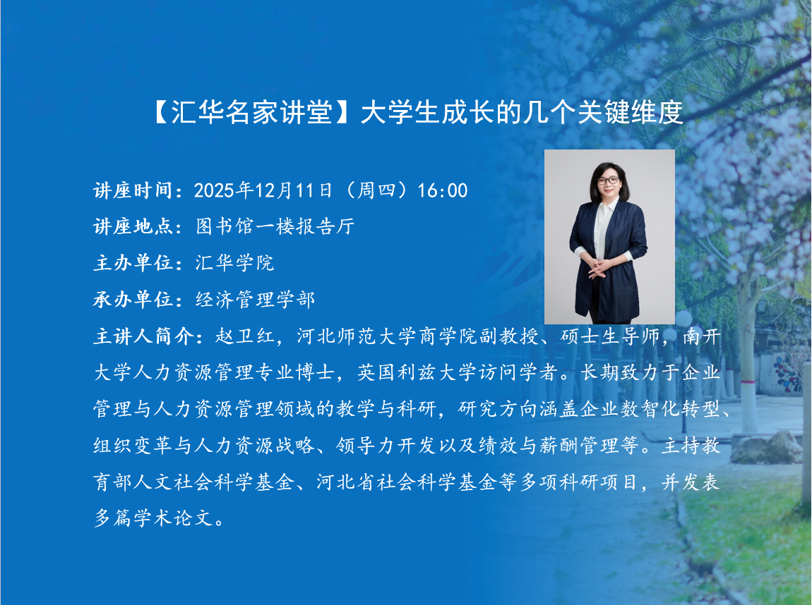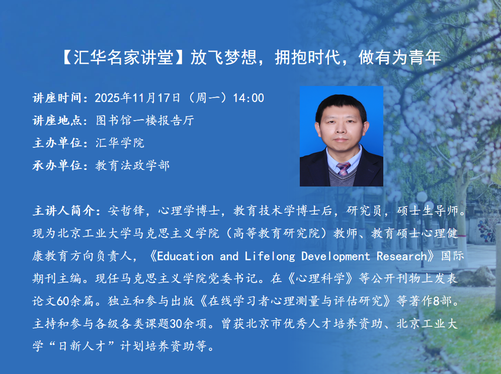 讲座题目:放飞梦想,拥抱时代,做有为青年讲座时间:2025年11月17日(周一)14:00讲座地点:图书馆一楼报告厅主办单位:Beat365唯一官方网站承办单位:教育法政学部主 讲 人:安哲锋主讲人简介:安哲锋,心理学博士,教育技术学博士后,研究员,硕士生导师,现为北京工业大学马克思主义学院(高等教育研究院)教师、教育硕士心理健康教育方向负责人,《Education and Lifelong Development Research》(教育与终身发展研究,ELDER)国际期刊主编。现任马克思主义学院党委书记。在《心理科学》、《中国远程教育》、《中国电化教育》等公开刊物上发表论文60余篇,人大报刊复印资料转载2篇,独立和参与出版《在线学习者心理测量与评估研究》、《网络招聘情境下求职者初步筛选研究》等著作8部。主持和参与各级各类课题30余项。曾获北京市优秀人才培养资助、北京工业大学“日新人才”计划培养资助等。内容简介:本次讲座以《放飞梦想,拥抱时代,做有为青年》为主题,结合党的二十大精神开展分享。主讲人将结合自身多阶段学习与工作经历,讲述与心理学相识、相知、相促、相惜的历程,融入宿舍生活、专业探索等真实故事。内容涵盖心理学应用、相关研究领域分享及 “六个一” 工程实践,兼具个人成长感悟与实用启发。面向学生传递坚持、寻趣、拓视野、勇担当的理念,助力青年成长成才,契合时代奋斗要求。