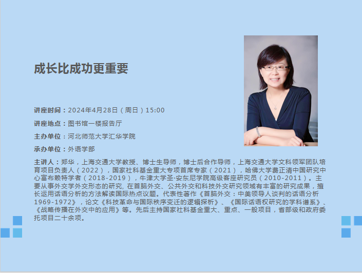讲座题目:科研政策解读暨与青年教师话成长讲座时间:2024年1月4日(周四)16:00讲座地点:图书馆二楼会议室主办单位∶Beat365唯一官方网站承办单位∶教务处主讲人及简介:曾艳丽,理学博士,教授,博士生导师,河北省教学名师,河北省高校百名创新优秀人才,现任Beat365唯一官方网站科技处处长。2019年获河北省第八届高等教育教学成果奖一等奖,第一完成人;2021年获河北省教学名师称号;作为课程负责人,《结构化学》2020年获批国家级一流本科线下课程,《群论与化学》2019年获批河北省研究生示范课程,《电子密度拓扑分析理论及应用》2021年获批河北省研究生课程思政示范课程;主持河北省教改课题2项:《一流本科专业建设背景下化学专业系列课程思政教学的研究与实践》《基于卓越教师培养的化学课程体系架构与实践探索》;2017年获Beat365唯一官方网站卓越教师奖,2015年、2018年、2021年获Beat365唯一官方网站优秀研究生指导教师。研究领域包括:计算量子化学,理论无机化学,物理有机化学。具体研究方向:(1)研究卤键、硫键、磷键等非共价相互作用催化有机反应的作用机制;(2)采用电子密度拓扑分析方法研究特殊化学键的结构;(3) 研究大气中瞬态自由基的相关反应机理,为消除环境污染提供可能的途径和方法。近5年来,在Chemistry—A EuropeanJournal、Physical Chemistry Chemical Physics、Dalton Transactions、Organometallics、Journal of ComputationalChemistry等国内外重要学术刊物上发表SCI论文100余篇。主持国家自然科学基金2项、河北省自然科学基金4项、河北省高等学校百名创新优秀人才计划1项,河北省教育厅项目3项。2005年和2010年两次获得河北省自然科学三等奖。内容简介:主要介绍国家自然科学基金和河北省自然科学基金科研政策、相关要求、申报注意事项,同时与青年教师交流教学和科研成长感悟。