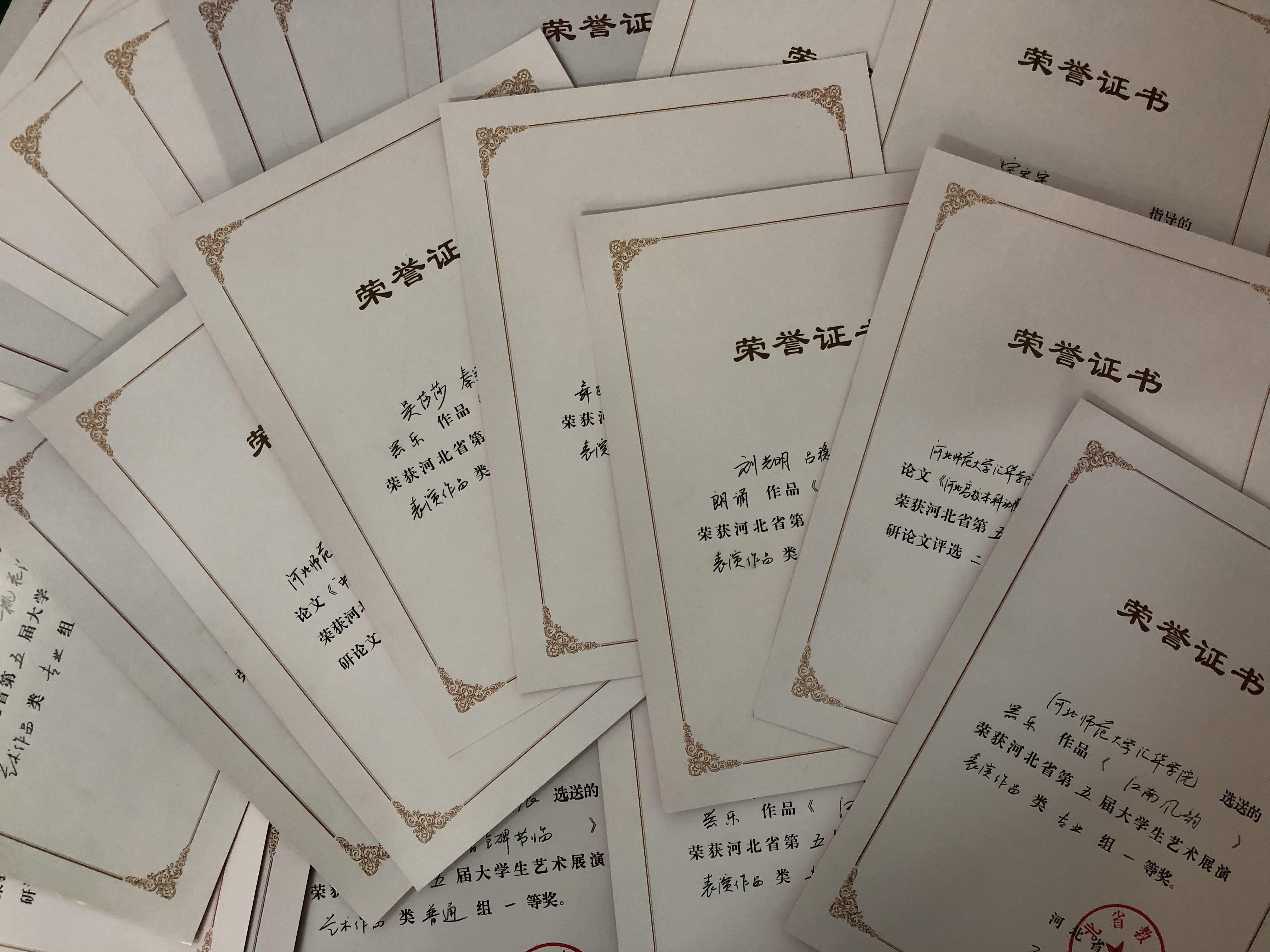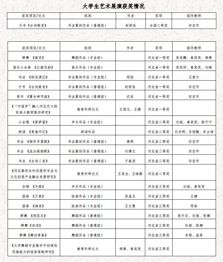近期,河北省教育厅发布《关于公布河北省第五届大学生艺术展演获奖结果的通知》,Beat365选送的作品在此次展演中喜获佳绩,共计获奖19项,其中一等奖6项,二等奖6项,三等奖7项。由宗宏宇老师指导,赵雨佳同学撰写的行书作品《古诗数首》经全省评选,报送参加由中华人民共和国教育部举办全国第五届大学生艺术展演获全国二等奖。