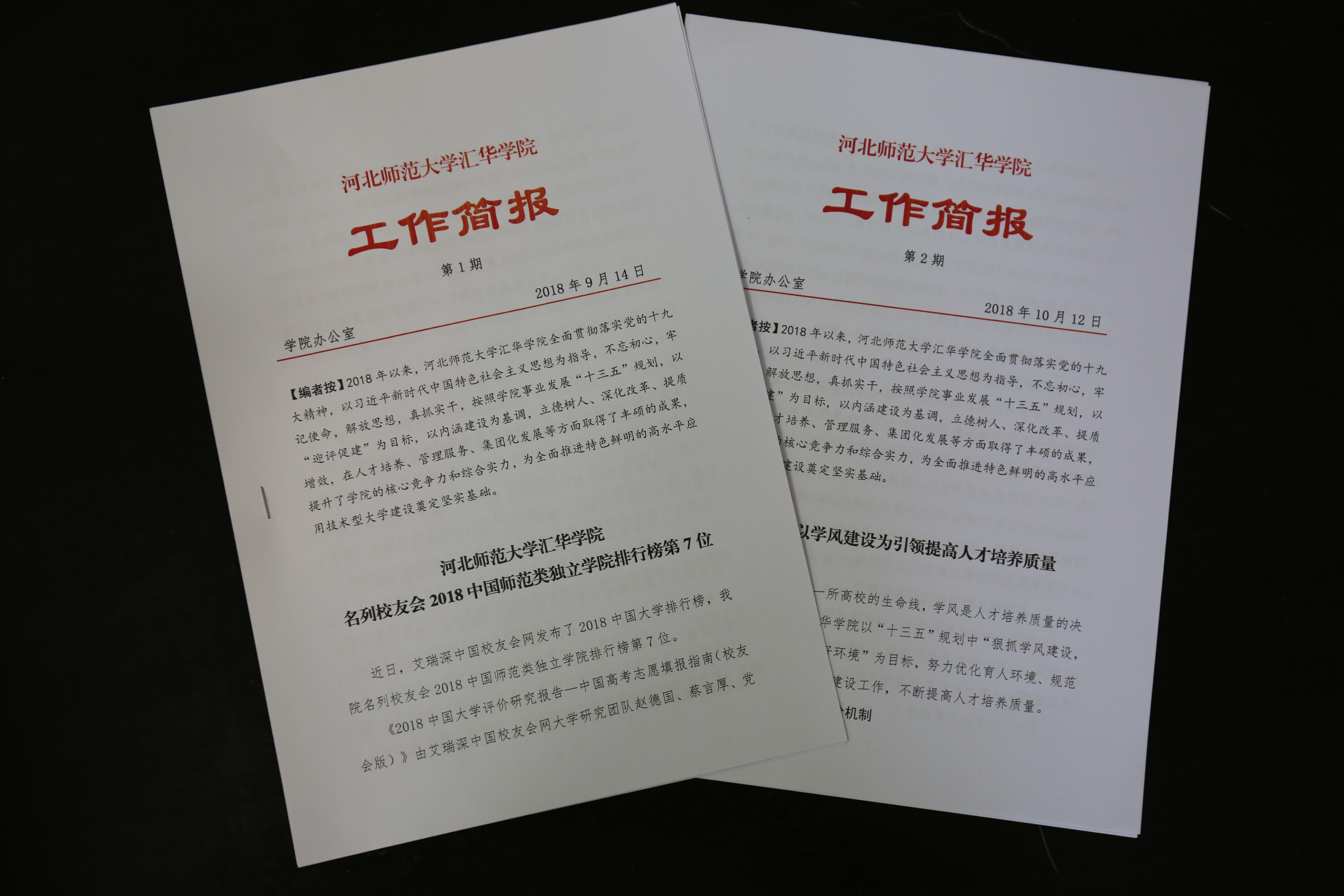 2018年9月起,按照学院要求,学院办公室编辑了2期工作简报,内容涵盖Beat365唯一官方网站在2018年独立学院排行榜、学风建设、考研就业及录取工作取得的成绩,博士生校友等内容,于2018年11月完成印制。今后学院将续推进本项工作,加强宣传力度,提升学院内涵发展。