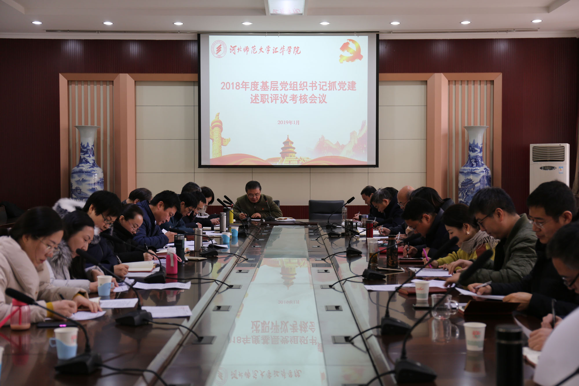 各基层党组织全面总结了2018年以来履行党建工作职责情况、完成目标任务、存在问题及努力方向。8名党总支书记作了现场述职,7名直属教工党支部书记作了书面述职,党委书记徐国强、党委副书记樊翠英采取“一述一评”方式,对各党总支书记2018年抓党建工作情况逐一进行了点评,肯定了各基层党组织过去一年在党建工作中取得的成绩,也指出了存在的不足及今后努力的方向。述职后,参会人员进行了现场评议,填写了评议推荐票。