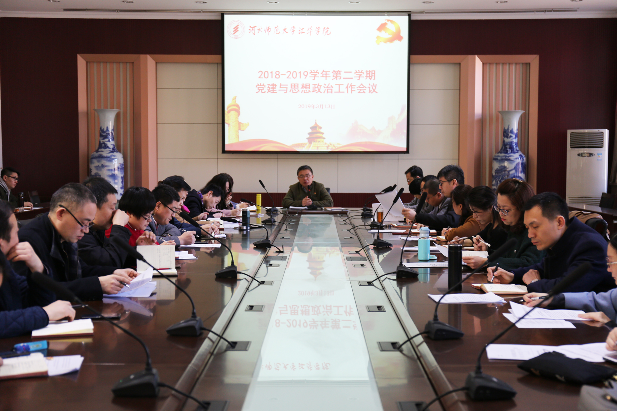 3月13日上午,Beat3652018—2019学年第二学期党建与思想政治工作会议在图书馆会议室召开。党委书记徐国强,党委副书记、副院长樊翠英,党委各部门负责人,各学部党总支、直属党支部的书记、副书记,各学部党总支、直属教工党支部秘书参加会议。会议由党群工作部副部长徐鹏主持。