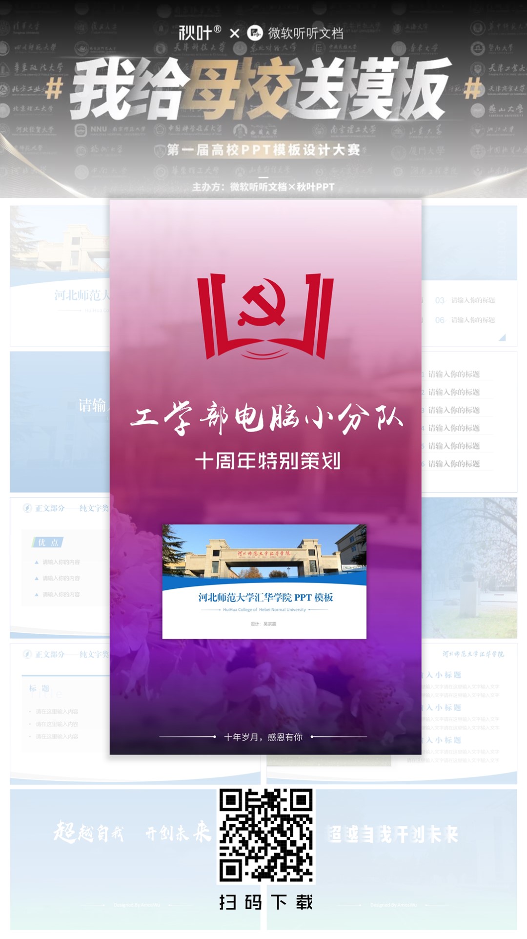 高校PPT模板设计大赛是由微软中国“微软听听文档”和秋叶PPT联合主办的第一届面向广大高校毕业生和在校生的PPT盛事。微软公司开发的Office系列办公软件深受广大高校师生的喜爱,PowerPoint更是作为演讲、授课、发布会、工作汇报等场合必不可少的一项。秋叶PPT,是一家在线教育内容提供商,现已成为国内Office领域领导品牌。在两个团队的强强联合下,本次比赛共收到500余份参赛作品,最终278份作品成功入围决赛,参赛者分别来自28个国内省份、2个国外城市的220所高校,清华大学、北京大学、昆士兰大学、复旦大学、武汉大学等国内外知名高校学生也参与了比赛。