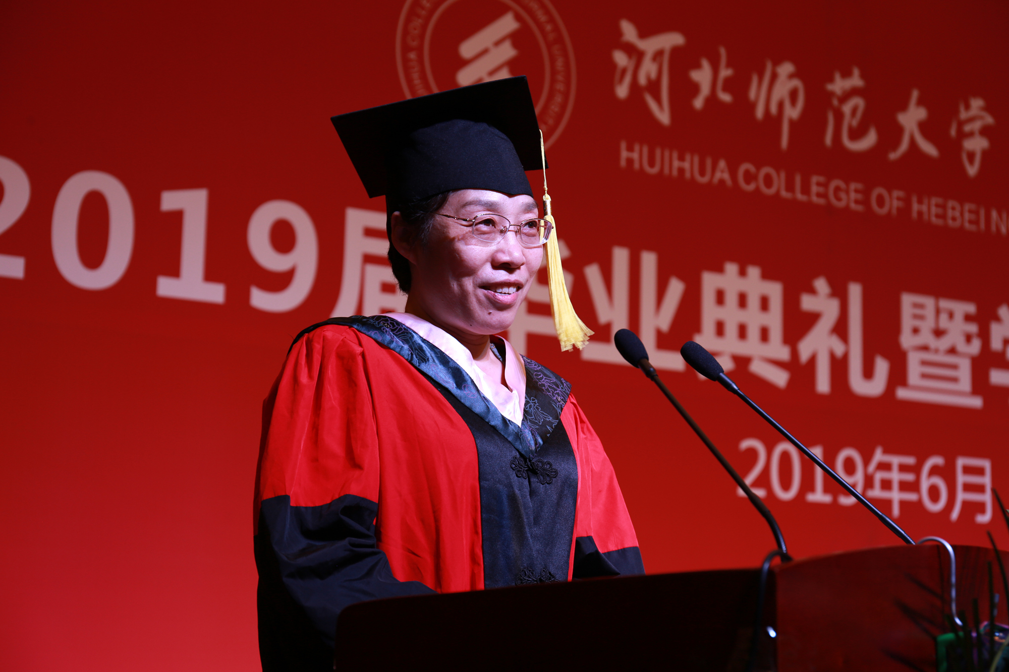 阎福玲在致辞中肯定了2019届学生取得的成绩,“正是因为有了一届又一届像你们这样的优秀学子,汇华这棵参天大树才会枝繁叶茂、桃李芬芳,才会在全国独立学院的排名中持续保持在前列。”在同学们即将奔赴新征程之际,他提出三点希望与同学们共勉。第一、志存高远,奉献社会。第二、自强自立,再造辉煌。第三,终身学习,提升境界。阎福玲最后深情话别毕业生:“常言说,大学是人生的第二故乡。诗人泰戈尔说:‘不管阳光把大树的影子拉得多长,它总是和根连在一起。’而我要说:无论大家走到哪里,走得多远,都走不出母校和师长们对你们的深情凝望,老师永远期盼你们建功立业、捷报频传!”