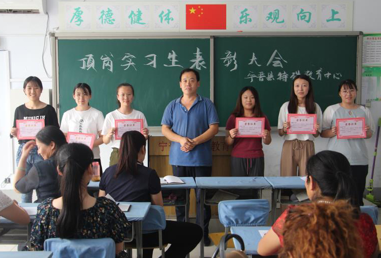 为进一步提高教育教学水平,六名顶岗实习生相互听课、学习,探讨。在隆尧特殊教育学校来观摩优质课的活动中,顶岗实习生王瑶展示了一节优质的生活语文课——《温馨的宿舍》,王瑶利用直观教学法、游戏活动法,激发学生们的学习兴趣,提高学生们的积极性与主动性。何文磊的课堂同样也焕发着光彩,她充分利用多媒体教具,教学设计完整,教学效果显著,在课堂练习这一环节中,她利用词语连线、选词填空的形式,把握了教学的重难点,通过课堂练习,能够检验学生们对本堂课知识掌握的程度;对于不足之处,她更是虚心请教,深受各位老师的好评。在宁晋县顶岗实习生教学技能大赛中,于海娇荣获一等奖、刘洋洋荣获二等奖、王瑶荣获三等奖。她们在一次次练习中总结经验,在付出与收获中获得成长,既提高了自身的教育教学技能、组织管理能力、人际交往能力,同时也加深了她们对教师职业的认同感,为日后成功就业奠定坚实的基础。实习期间,她们勤勤恳恳,甘于奉献,深受实习学校领导以及指导教师的肯定,评为宁晋县特殊教育中心“优秀实习教师”。