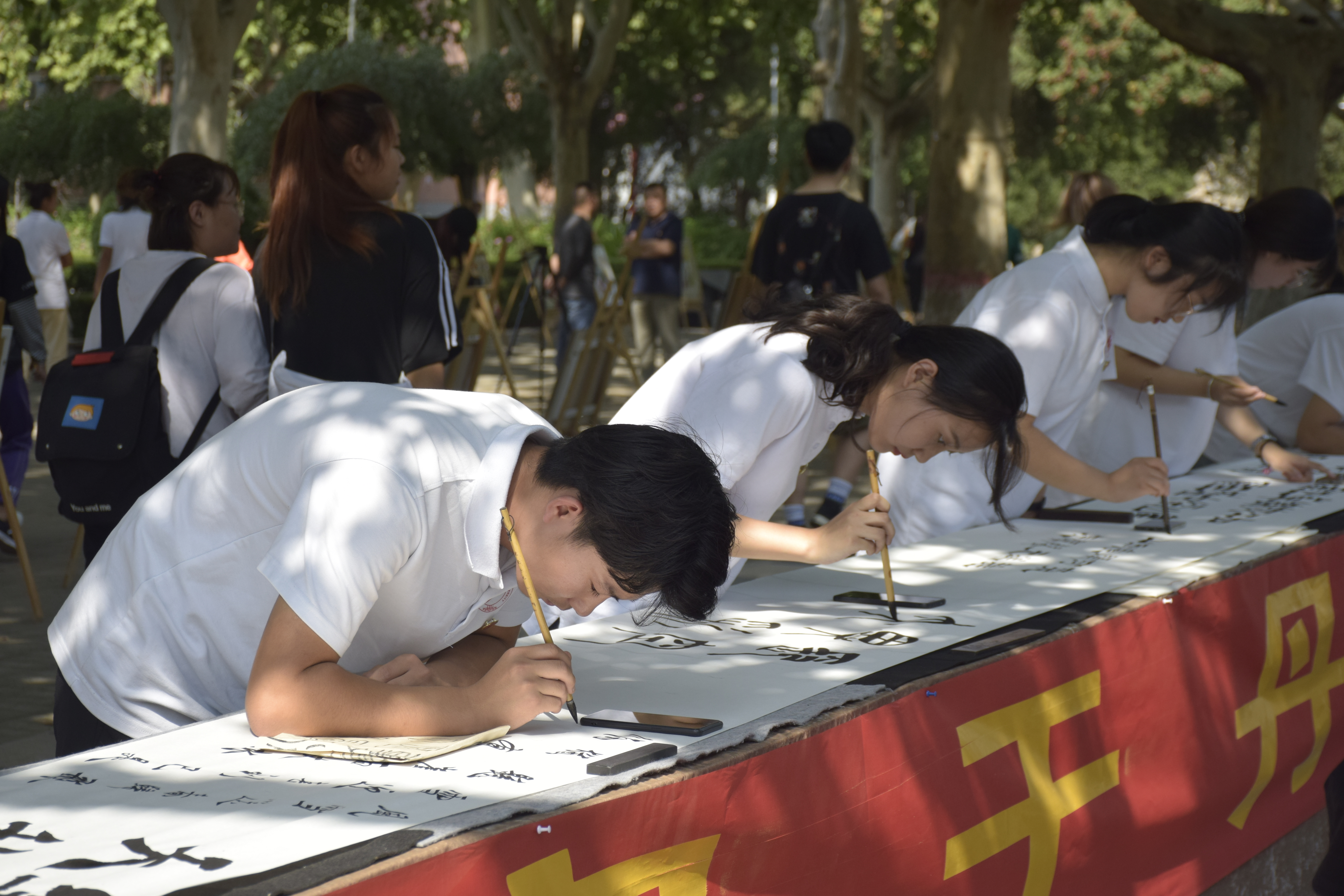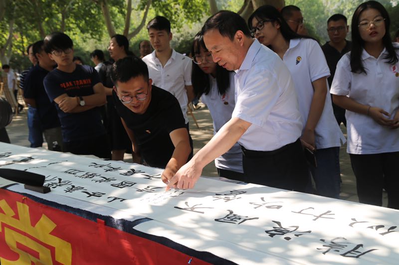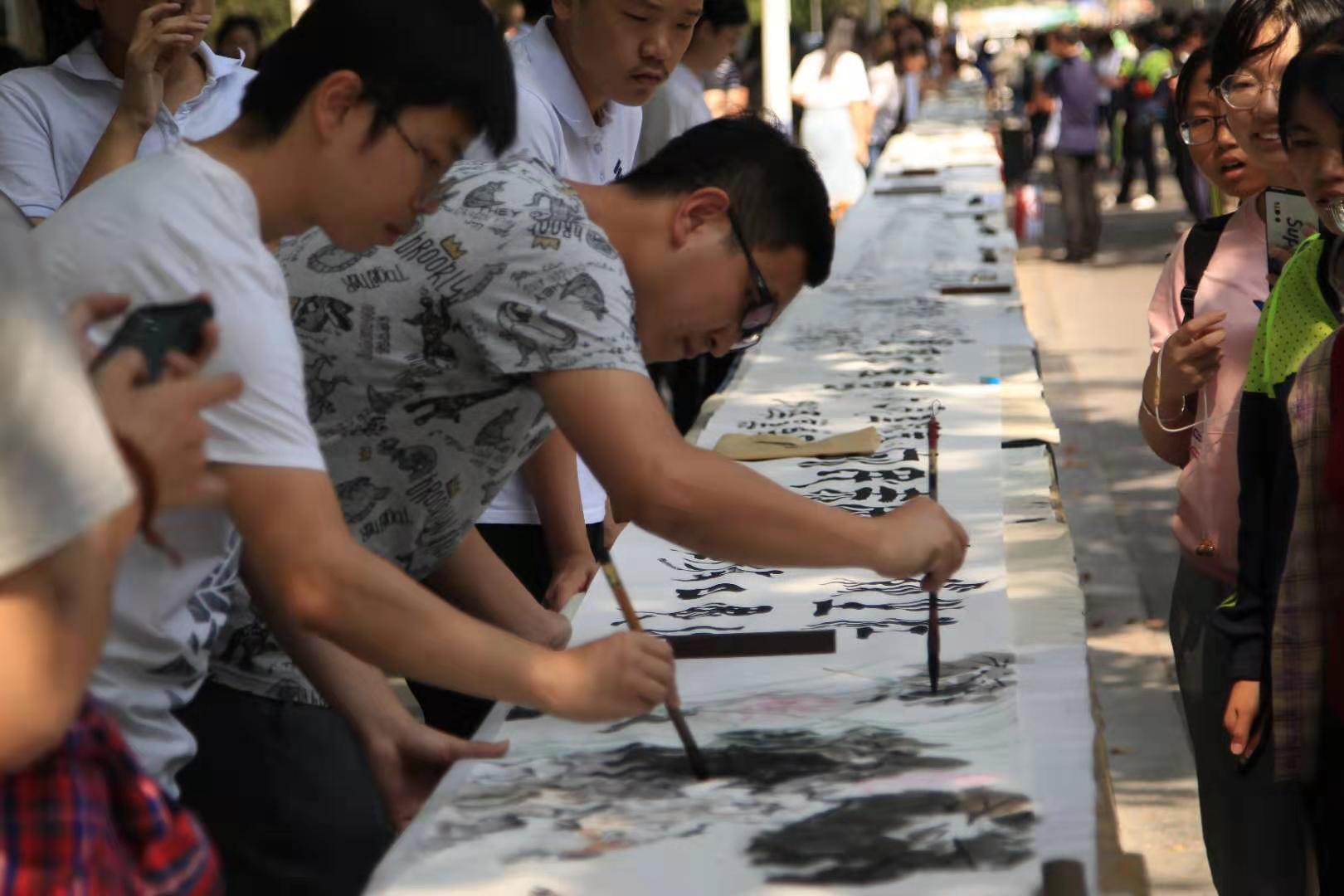 本次活动由两部分组成。“七十米长卷颂党恩”是由4位专业教师带领书法学专业54名学生现场挥毫,在70米的巨幅长卷上,共同创作出一幅具有鲜明时代特征和强烈感染力的书画艺术作品。书法学教师王彦杰、王倩茹启笔题写卷首。王彦杰老师汉隶书法作品“同心干,放眼量”取材于毛泽东诗词“唤起工农千百万,同心干,不周山下红旗乱”、“风物长宜放眼量”,展示了一代伟人的雄伟气魄和博大胸怀。美术学教师王健、邢森以写意“红花墨叶”的表现手法共同创作国画作品《莲塘禽石图》,主体部分荷花有“花中君子”之称,“荷”与“和”、“合”谐音,寓意和平、和谐、合作、合力。书法学专业学生用篆、隶、楷、行、草等字体,执笔蘸墨、尽情挥毫,用笔下独具东方艺术魅力的书法艺术赞美祖国母亲,抒发对国泰民安的美好祝愿。一幅紧扣时代脉搏、讲述中国故事、弘扬民族精神、展现文化自信与讴歌祖国发展的70米书画长卷徐徐展现在广大师生面前。“美在江山,寓于丹青”红色主题作品展环节,美术学、环境设计、视觉传达设计、动画等专业推荐了70幅具有代表意义的艺术作品,在校园内进行展示。这些作品从不同角度展现了伟大祖国70年来在党的领导下所取得的巨大成就,展现了昂扬向上、不断进取、追求美好生活的时代精神,展现了学院师生良好的精神风貌和艺术素养。