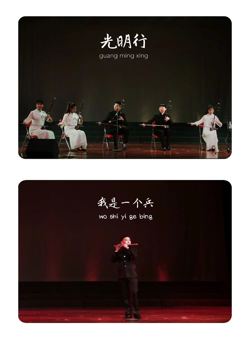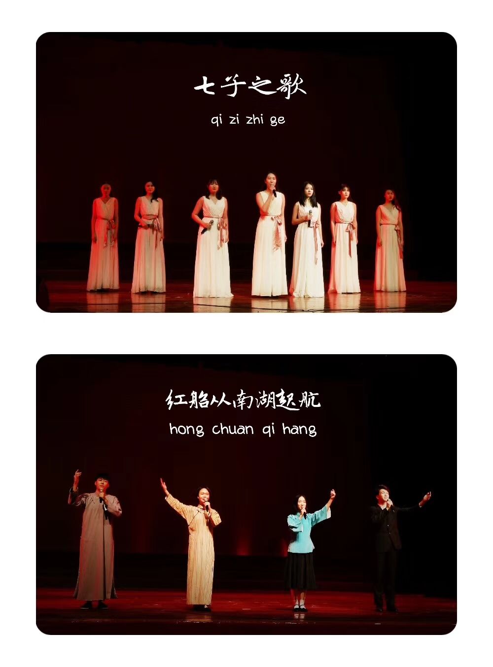 本学期,艺术学部、传媒学部师生将反映中国近现代史题材的艺术作品,按历史发展线索编排成一场专题演出。《听妈妈讲那过去的故事》揭开了演出帷幕,整场演出分为“东方曙光”、“不屈长城”、“胜利凯歌”、“砥砺前行”四个篇章,形式包括诗朗诵、舞蹈、独唱、合唱、器乐演奏等。诗朗诵《七子之歌》《红船,从南湖起航》,舞蹈《使命·初心》《中国妈妈》《思念》,器乐演奏《光明行》《我是一个兵》,独唱《松花江上》,男女二重唱《曙色》,小合唱《十送红军》《游击队之歌》,合唱《不忘初心》《向着伟大梦想》等节目,用多样的艺术手段、真挚的情感,充分表达了在中国共产党的领导下,无数革命先辈们通过艰苦卓绝的斗争,带领中国人民取得了从屈辱到复兴,从苦难到辉煌的丰功伟绩。精彩的表演为在场师生奉献了一场革命历史题材艺术表演的视听盛宴,现场不时响起阵阵热烈的掌声。