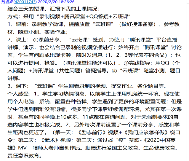 任课教师结合专业、课程特点和学生实际,化身“网络主播”,认真做好教学准备,创新授课模式,用“十八般武艺”备战线上课堂。艺术学部王健老师在讲授《中国画写意人物一》课程时,结合美术专业特点,通过手机摄像直播进行人物的造型表现示范,运用不同的直播模式,将理论与实践指导结合起来。承担工学部《数据库与信息管理系统》课程的王艳君老师在QQ群直播授课过程中利用群投票功能进行随堂测试,并随机点名提问,在线批阅作业(红笔点评、写评语、给ABCD等级)。在思政课上,老师们将党中央重大决策部署、防疫抗疫中涌现出的先进人物和典型事迹融入到思政课教学中,结合疫情防控开展专题教学,做好学生的思想和价值引领。传媒学部、外语学部等学部开展线上“最美笔记”展示活动,选取优秀的课堂笔记通过学部网站、微信公众号进行推送,营造了良好的学风。