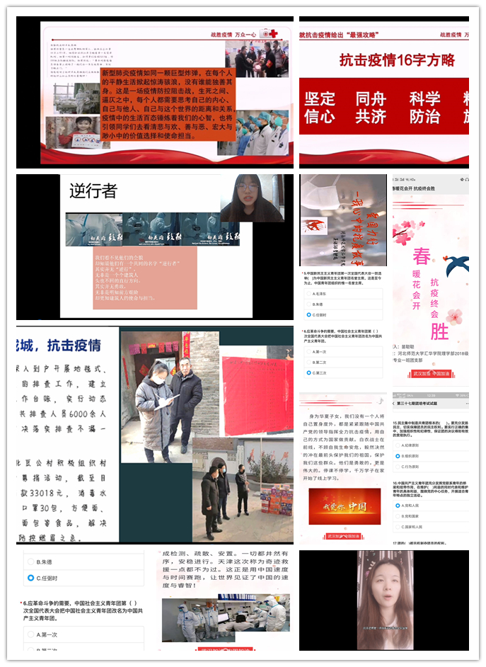 在疫情防控的关键时期,参训学员积极参与“爱国力行,我心中的抗疫故事” 团员青年共讲思政微课活动。在参训学员中征集到视频微课、图文微课300余份,有的用团员的视角讲述中国全民抗疫感悟、诠释新时代的中国精神;有的结合当前疫情防控过程中的内心体会和感受,讲述自己心中的爱国主义,结合自己的青春成长经历,分享所认知的新时代爱国主义精神;有的用青年的话语体系生动讲述抗击疫情的动人故事;有的结合疫情爆发及防控过程中,自身及家人、同学、朋友对人生意义、生存方式及幸福追求的思考,分享属于新时代青年的责任担当与青春梦想。