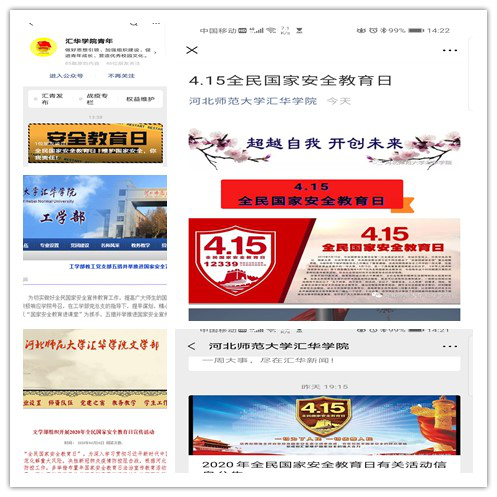 抓重点,多形式。学院按照今年国家安全教育日“坚持总体国家安全观,统筹传统安全和非传统安全,为决胜全面建成小康社会提供坚强保障”的活动主题,以深入宣传以习近平同志为核心的党中央关于总体国家安全观、国家安全工作的重大部署和要求为重点,抓住“两个统筹”,突出非传统安全内容,通过学院网站、官微、校讯通及各单位部门网站、钉钉(微信、QQ)工作群等形式,积极向广大师生普及国家安全知识,特别是公共卫生安全、生物安全、疫情防控知识等内容,做到了疫情防控和国家安全宣传教育两手抓、双促进。