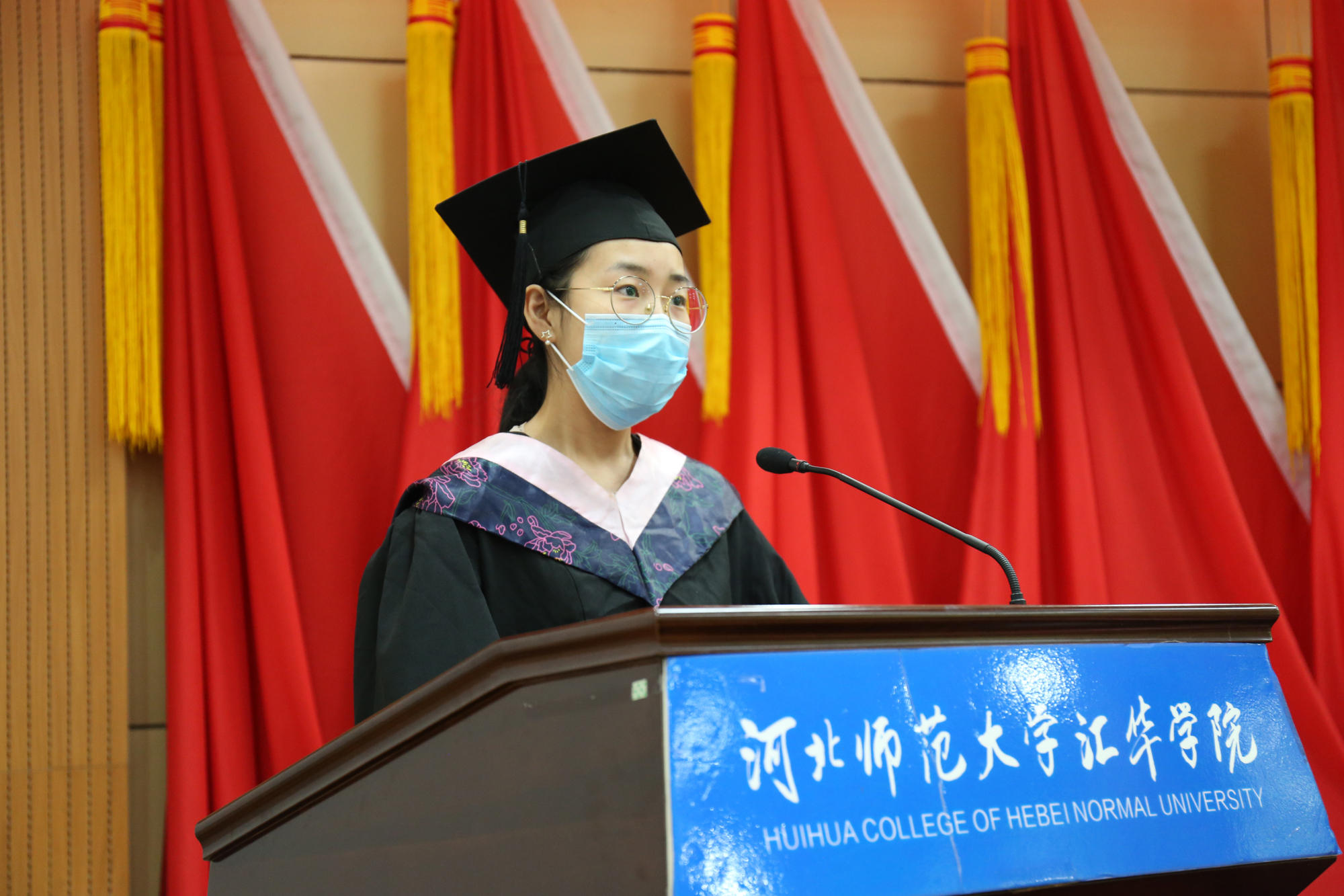 毕业生代表汉语言文学专业2020届毕业生董薇在毕业典礼上发言。她说,四年里,每一位老师都引领着我们,吸引着我们,指导着我们在知识的海洋中徜徉。今后,我们会将老师的谆谆教诲牢记心间,努力在为人民服务中茁壮成长,在艰苦奋斗中砥砺意志品质,在实践中增长工作本领。