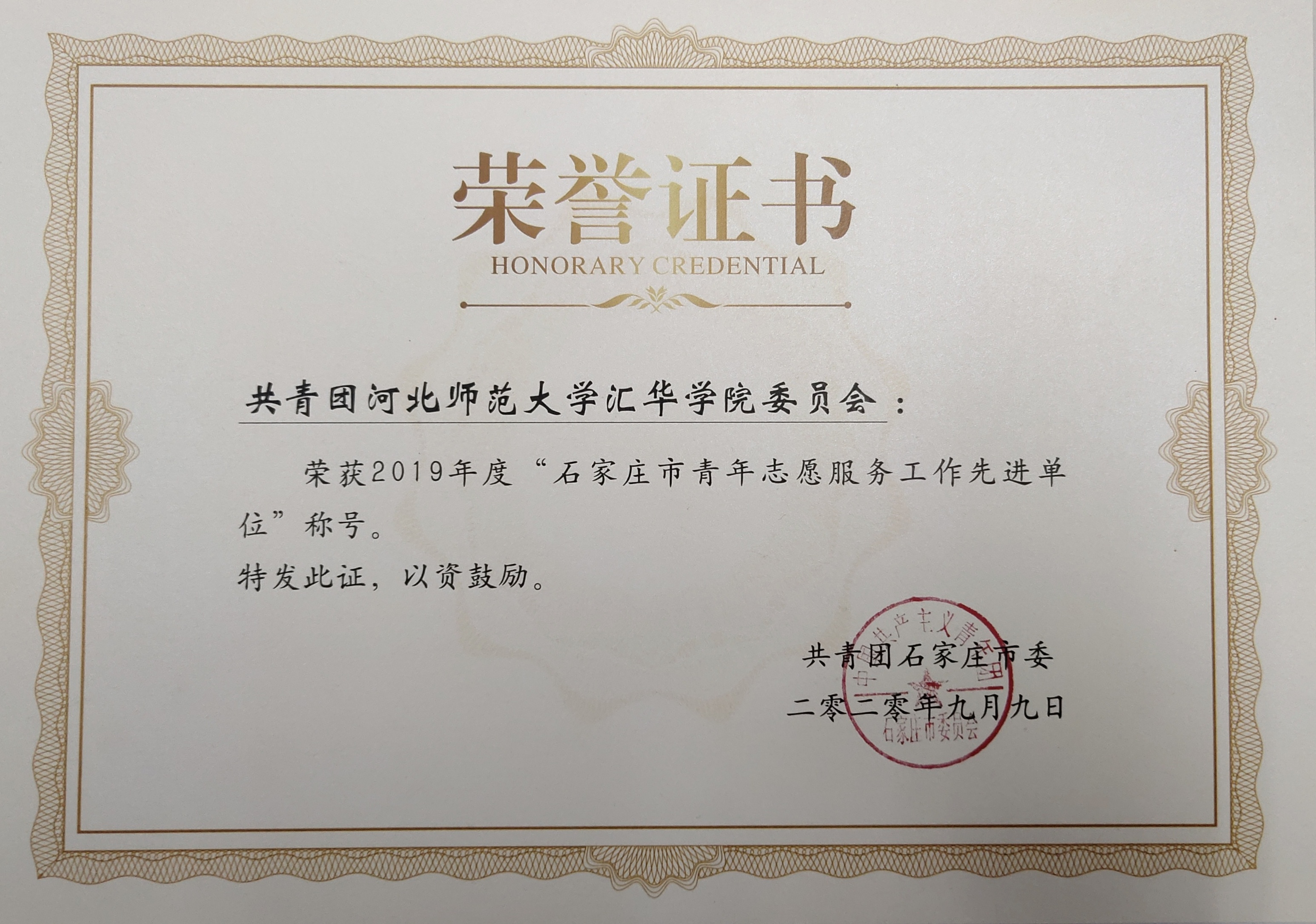学院团委荣获2019年度石家庄市青年志愿服务工作先进单位