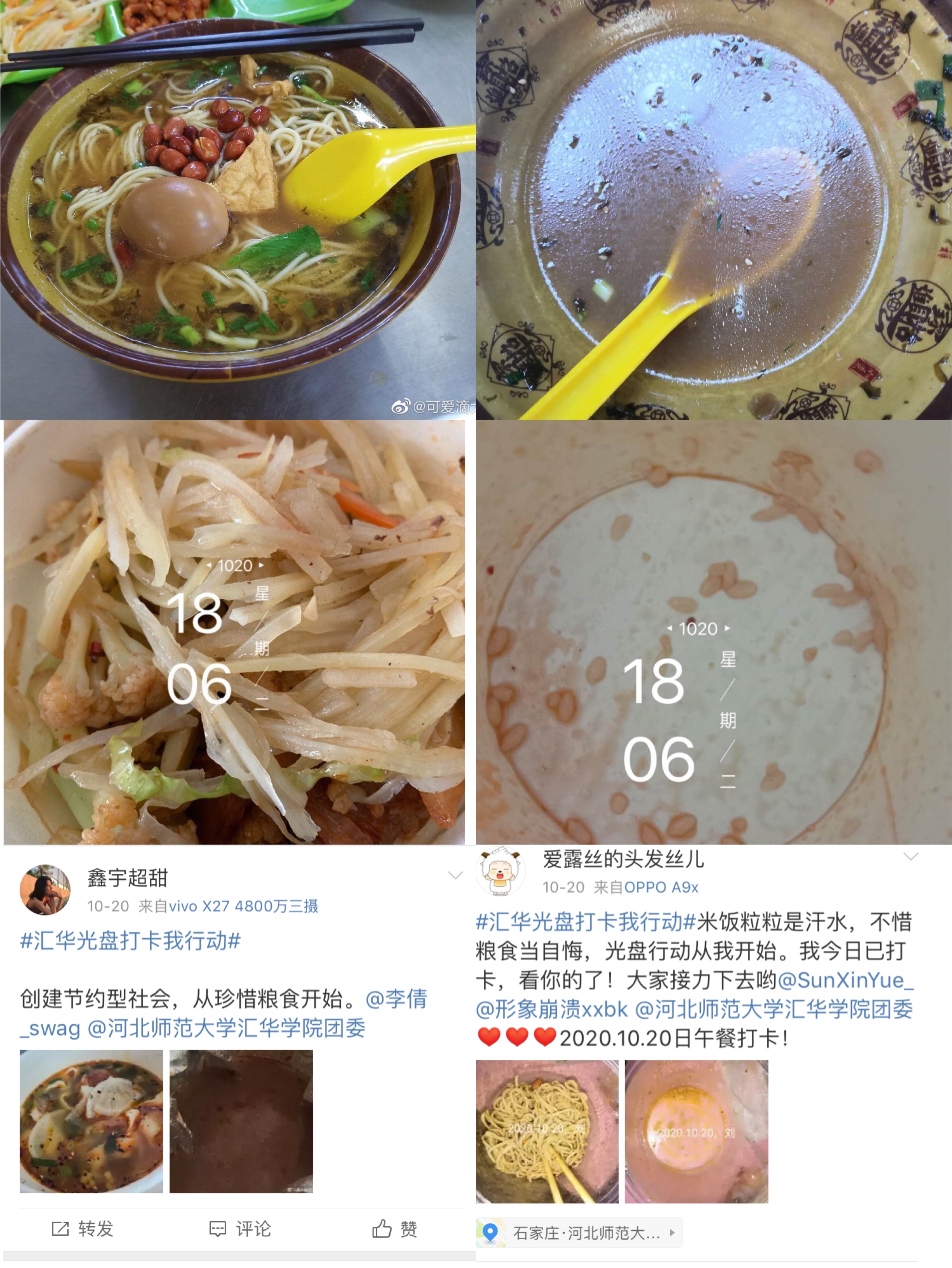本次活动通过腾讯QQ、新浪微博两个平台分别进行。截止到活动结束,QQ平台接力打卡活动覆盖千余名汇华学子;新浪微博平台话题#汇华光盘打卡我行动#流览量达160万,参与讨论人次近8000。