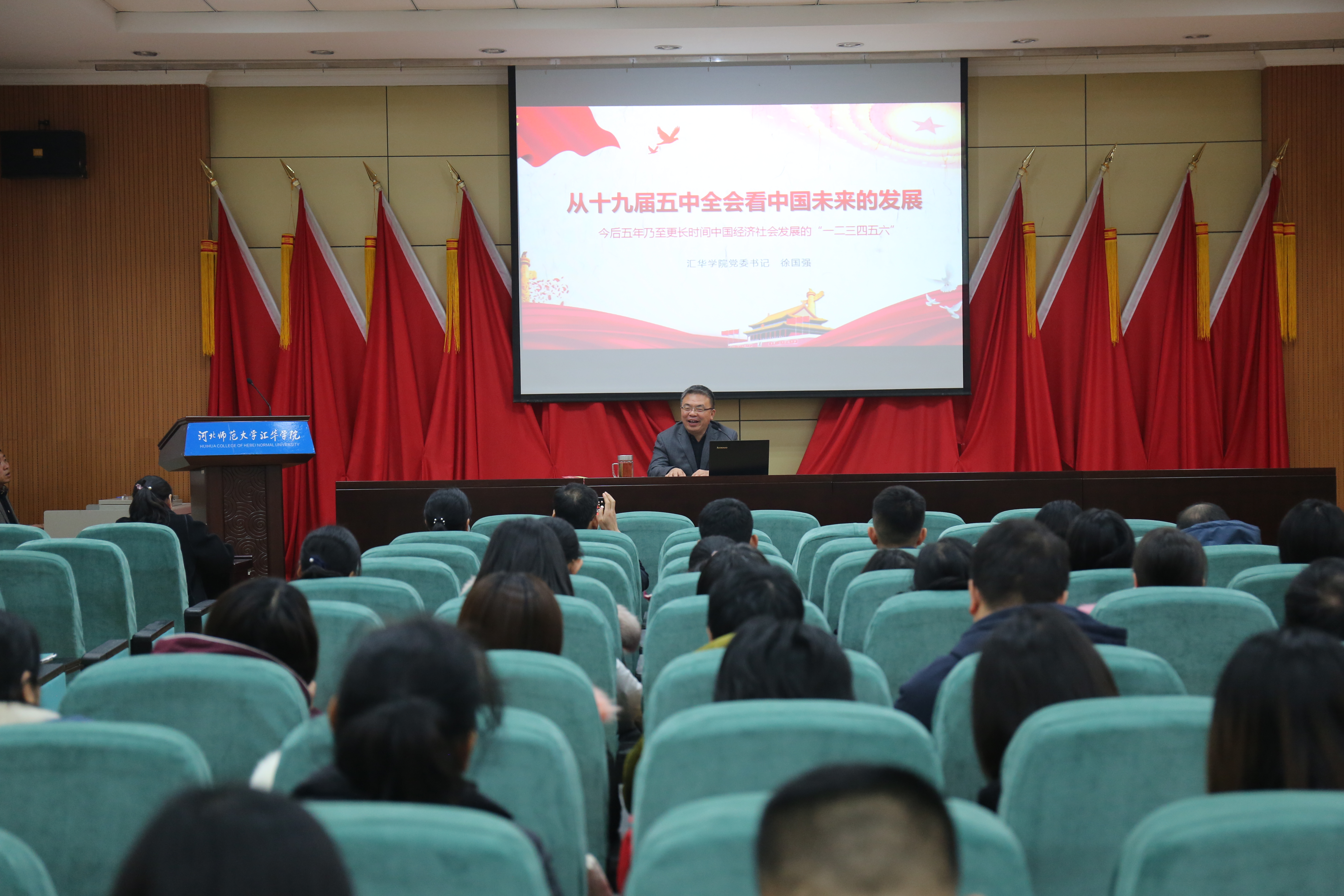 11月25日,党委书记徐国强在图书馆报告厅为全院教工党员作了题为“从十九届五中全会看中国未来的发展”的报告。徐国强围绕“一个奋斗目标”“统筹两件大事”“三个新贯穿全文”“四个全面新布局”“五大新发展理念”“六个发展目标”六个方面对全会精神进行了系统阐述和深入解读。他希望广大教工党员认真学习贯彻全会精神,准确全面把握“十四五”规划建议的重大意义,从国家发展的大格局制定个人规划,引导青年学生为国家未来发展贡献青春力量,实现汇华梦、中国梦。