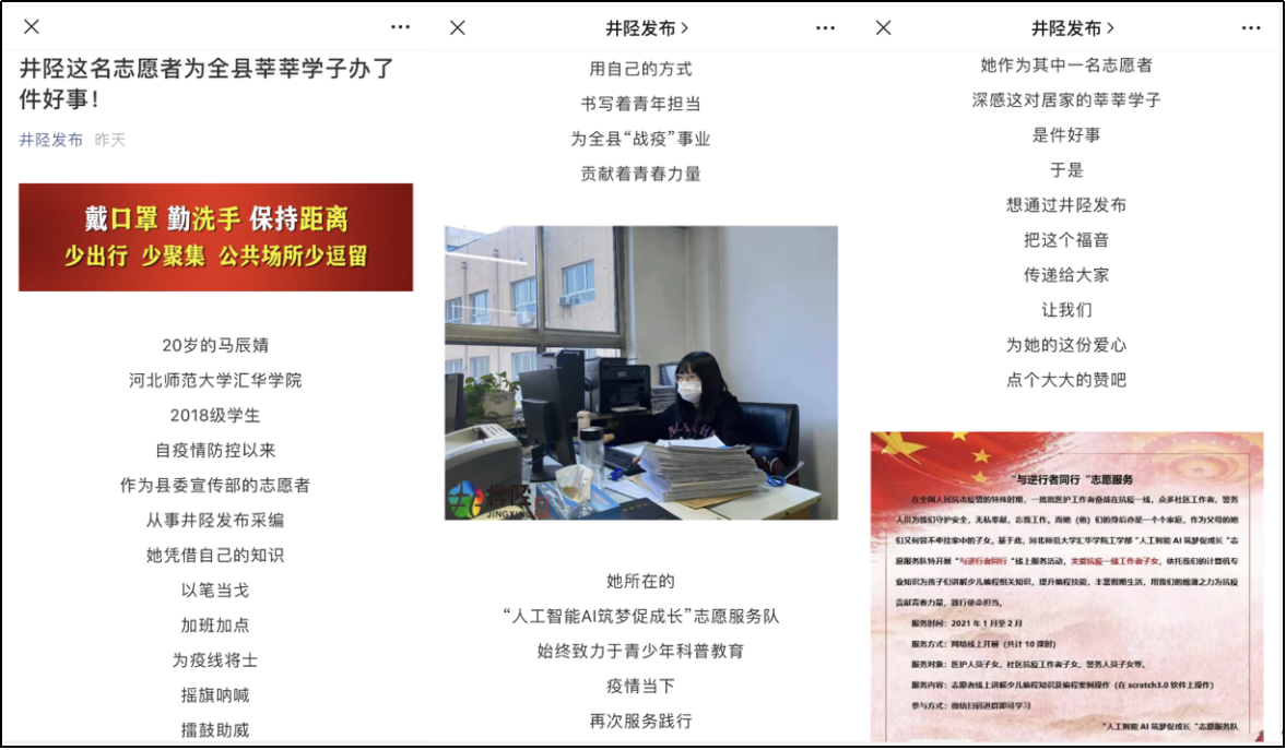 疫情防控以来,马辰婧踊跃报名,成为井陉县委宣传部新闻部的一名志愿者,参与井陉县委宣传部文字采编工作,凭借自己的知识,以笔当戈,加班加点,为疫线将士摇旗呐喊、擂鼓助威,用自己的方式书写着青年担当,为井陉全县“战疫”事业贡献着青春力量。她作为Beat365唯一官方网站工学部“人工智能AI筑梦促成长”党员志愿服务队的成员,通过“井陉发布”积极宣传服务队“与逆行者同行”志愿服务活动,开展人工智能在线教学,将科普知识传递给井陉地区莘莘学子。