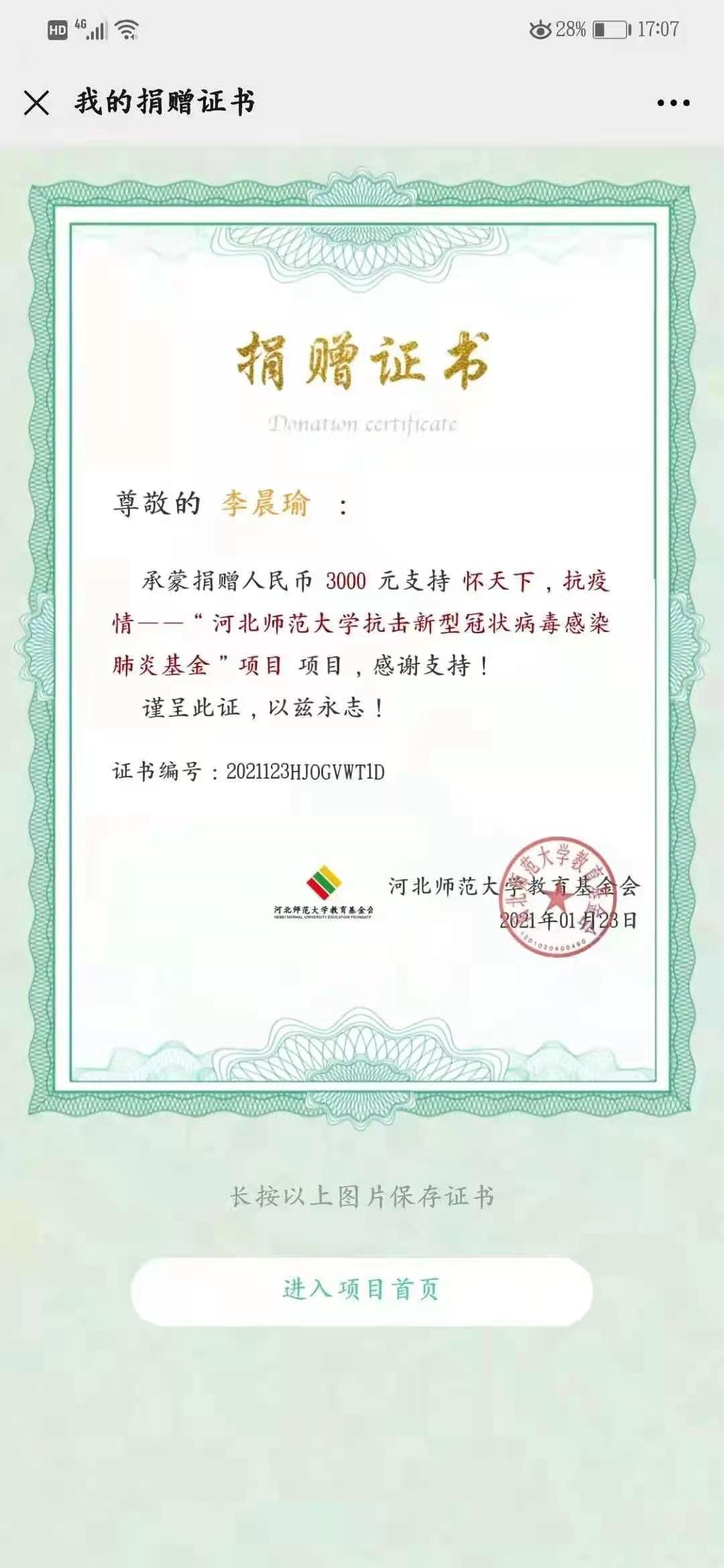 半个月来,李晨瑜的家长始终关注着石家庄疫情的发展,每天更新的新闻消息,以及女儿每天的朋友圈和忙碌的防疫统计、打卡,让他们感到非常揪心。听孩子讲学院老师们疫情期间克服困难、坚守岗位,在石家庄滞留同学积极上阵、争做志愿者的故事。身为共产党员的他们,决定要为学院抗疫尽一份自己的力量。“考虑到捐赠物资不太方便,就想到了捐款这种形式”。李晨瑜的父亲希望在石家庄的学院师生在全力防疫抗疫的同时好好保重身体,与所有汇华学子共同守望春暖花开。