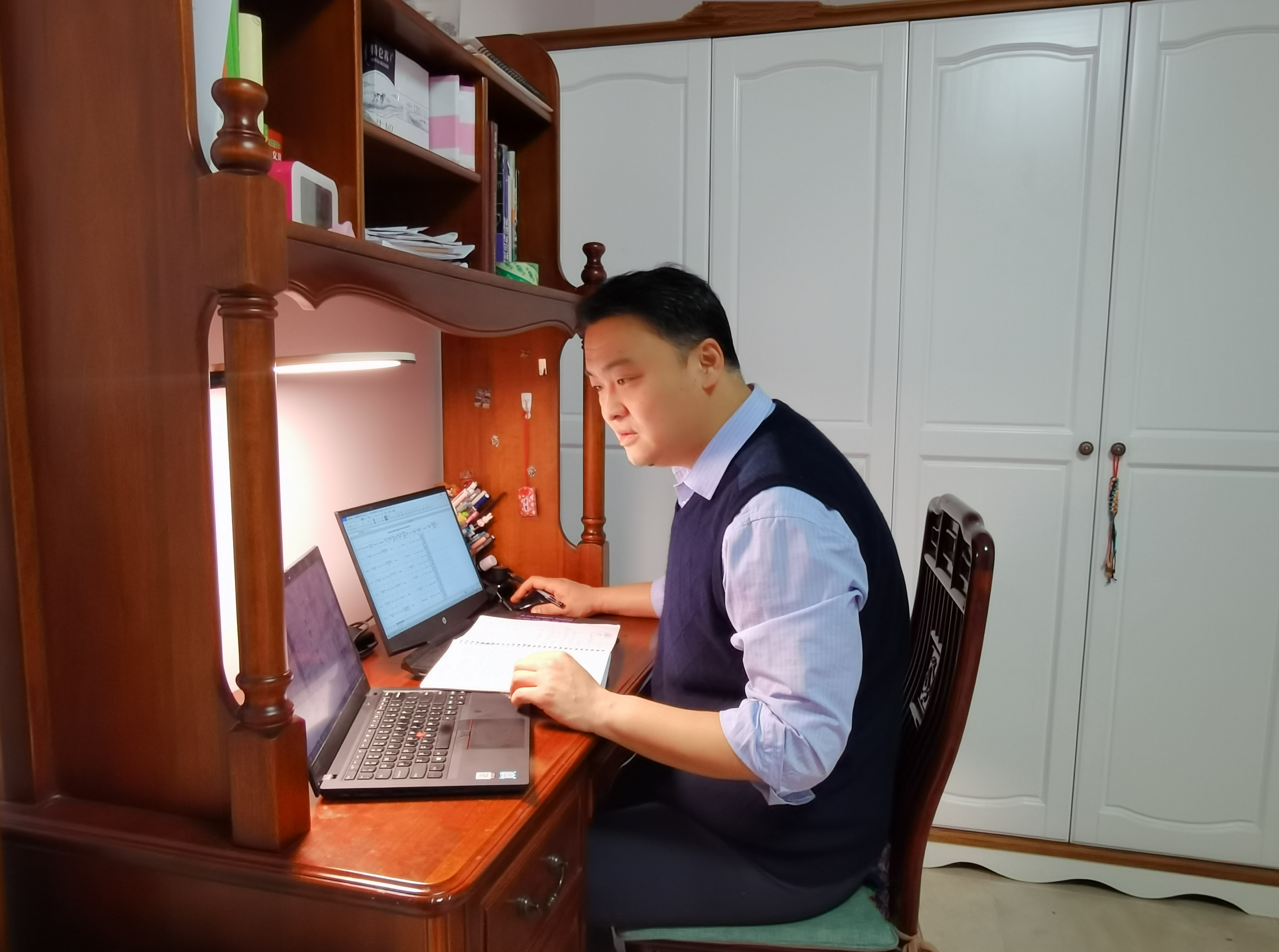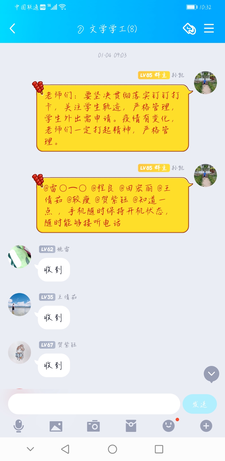 自疫情以来,为加强对学生的管理、畅通渠道,建立了文学部辅导员队伍QQ、微信抗疫专群。通过这些网络平台,进一步完善和规范抗疫工作,将上级的精神和各项工作及时传达给每一位辅导员,层层压实责任。截止目前,通过QQ、微信群发布各类通知、要求、工作布置等100余条,两个群聊天记录近百页,召开视频、音频学生工作会议十余场。疫情来势汹汹,唯有给自己加码才能更好地完成抗疫工作,两个孩子交给妻子照顾、日常家庭琐事也交给妻子,全身心投入到工作中去,很多时候凌晨还在汇总数据、召开辅导员视频音频会议、发送各类文件、布置各项排查工作,但他相信自己所做的工作会为抗疫作出积极贡献,所以一直不遗余力地做好各项工作,有效地完成了上级布置的各项工作任务。