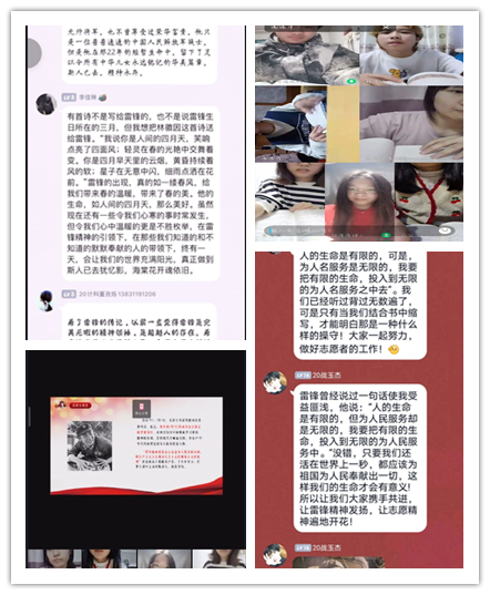 “‘悦’读经典,感悟雷锋”活动。院青协紧密结合疫情防控常态化形势,进一步丰富学生居家期间文化生活,积极培养良好的阅读习惯,组织全院青年志愿者开展阅读经典,感悟雷锋精神活动,以提升团员青年对雷锋精神的认同感,增强“学雷锋”积极性。文学部青协通过QQ邮箱征集优秀活动照片,评选的优秀活动照片于青协QQ空间进行展示,传播了助人为乐的雷锋精神。理学部、教育法政学部志愿者们每周在网上进行读书交流会,交谈自己的读书心得,并以音频、视频、PPT等形式对阅读成果进行展示,使雷锋精神深入人心,营造了温暖有爱的氛围,让爱传播于社会。