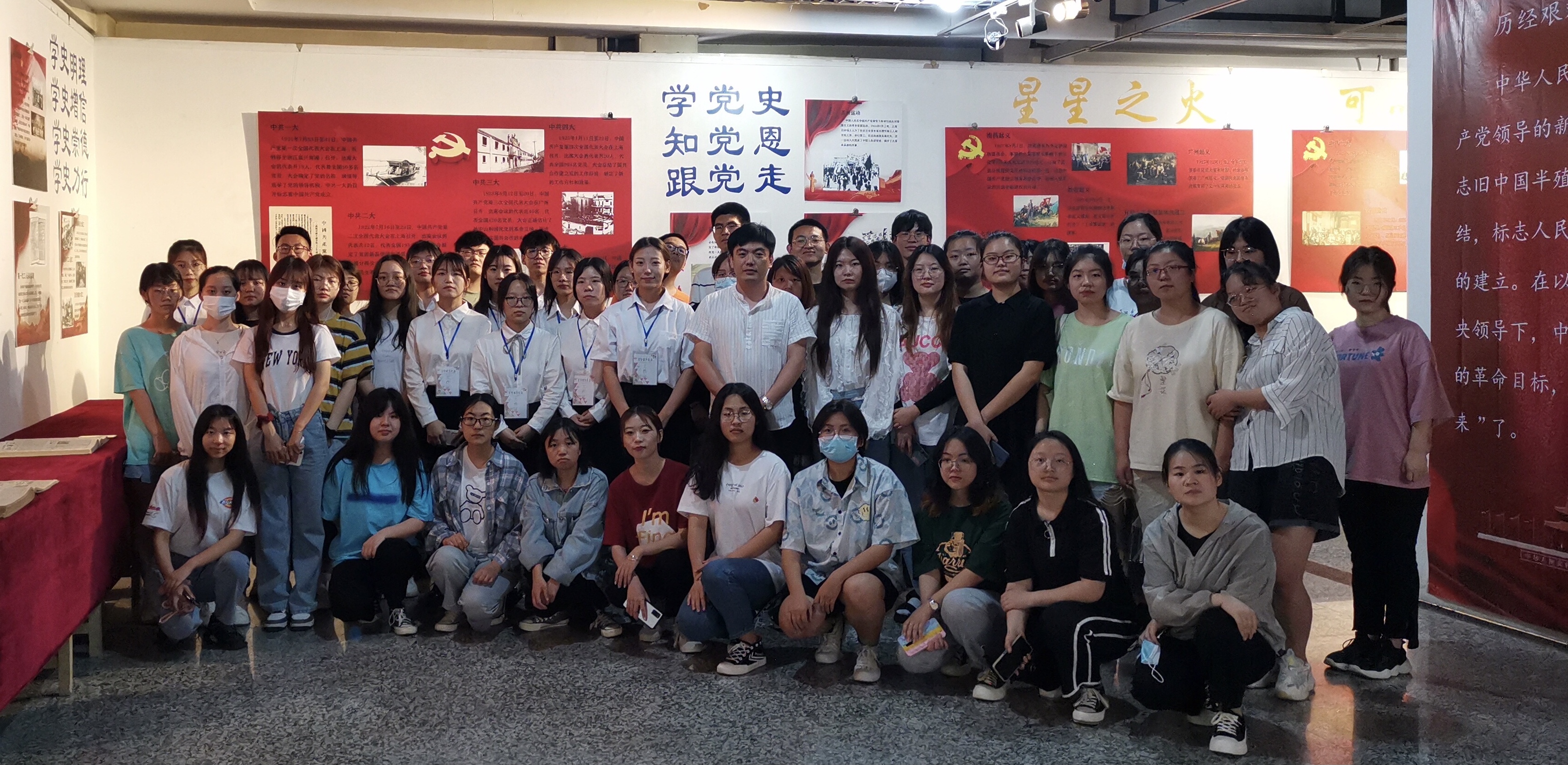 此次展览在文学部教师指导下,由历史学专业的学生分小组、分阶段历时两个月的时间进行展览前期的资料收集,共整理出71个历史事件、八十余张图片和近万字文字材料,展览中文学部历史学专业和汉语言文学专业的郑秋烨、彭雪迪和丁宁等17位同学担任了讲解工作。历史学专业学生通过整理资料,重温了中国共产党100年的光辉历程,进一步激发了学生爱党、爱国的热情。讲解员以实际行动传承红色基因,从党的光辉历史中启迪智慧,砥砺品格。