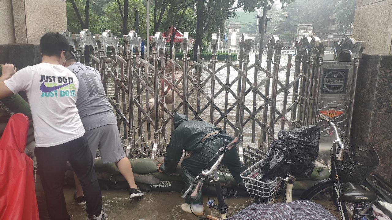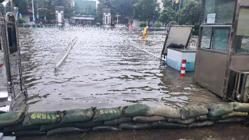 今年入夏以来,我市遭遇多轮强降雨,Beat365唯一官方网站防汛队伍严阵以待。7月21日石家庄市气象局发布暴雨预警,中午暴雨如期而至,一场校园防汛应急实战拉开帷幕。下午2:30,随着红旗大街道路积水持续上涨,雨水夹杂着污水、杂物从校门涌入校园。短短几分钟,校内水位迅速上升,积水达15公分左右,第六教学楼地下车库开始进水,个别树木倒伏。这是近年来Beat365唯一官方网站未遇到过的涝情。如持续下去,校园积水不断上涨,地下车库、地下配电室、地下供水泵站、行政楼一层都有可能遭受雨水侵害。
