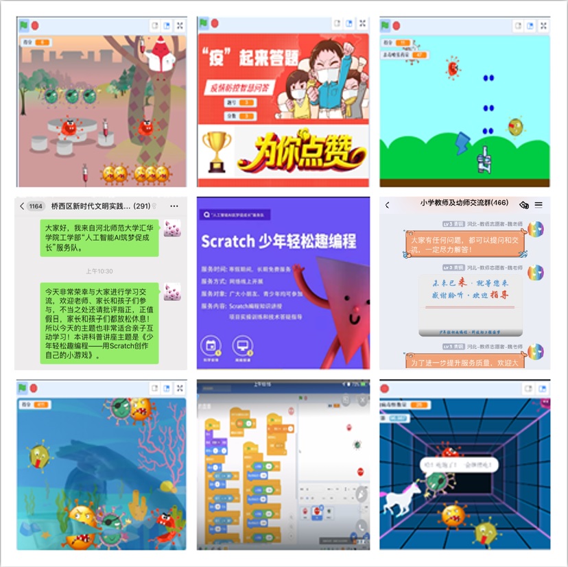 编程技术广分享,多师聆听共奋进。立足青少年编程教育,为了推动形成新时代文明实践科普合力,扎实做好科技志愿服务工作,更广泛的服务于民、惠及于民,党员教师代表于桥西区新时代文明实践志愿服务活动群、小学教师及幼师交流群为750余名幼师、小学教师、家长、学童进行《少年轻松趣编程——用Scratch创作自己的小游戏》科普分享,涵盖小勇士大战病毒怪、小勇士射击病毒怪、小飞马狂吃病毒怪、体感疯狂大战病毒怪、疫情防控智慧问答等编程游戏作品,进一步与群友交流探讨了“青少年编程教育的发展与探索”,团结带领一线教育工作者服务群众、服务学生。