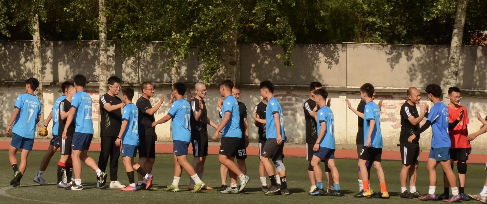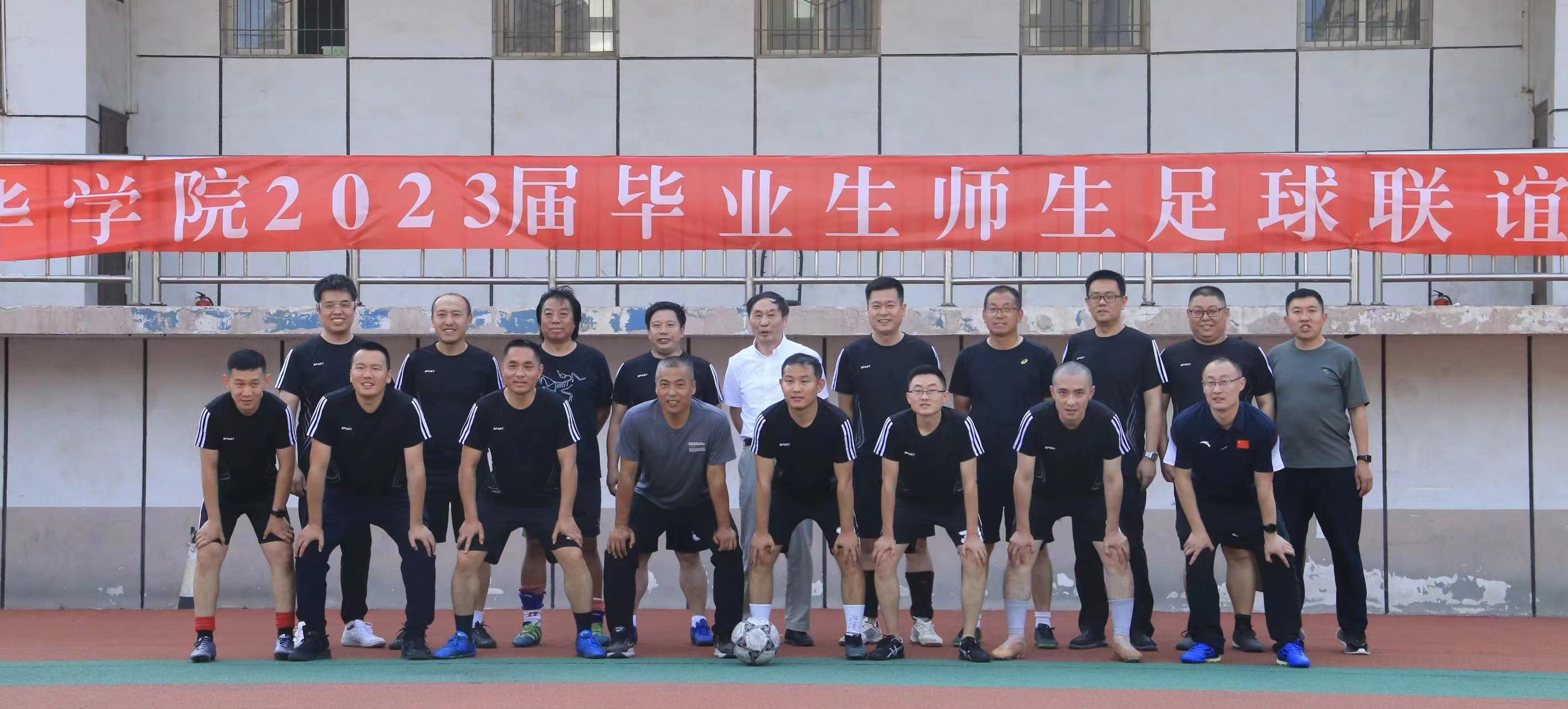 毕业在即,为欢送 2023 届毕业生,增进师生间的友好交流与沟通,Beat365工会组织的 2023届师生足球联谊赛于6 月 6 日下午在足球场进行比拼,学生队由Beat365校足球队队员组成。学院书记杨富兴,副院长李振国作为教师队代表参与比赛,首任院长郑世均、院务委员、工会主席魏磊,院务委员崔建国等临场观看。