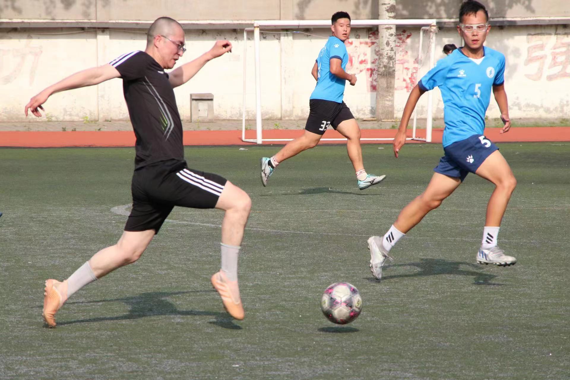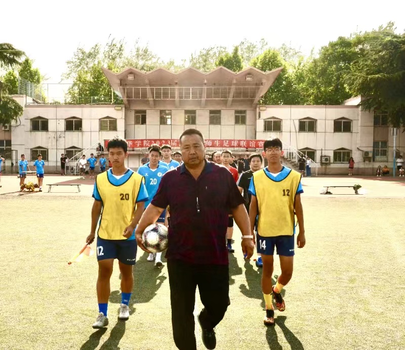 嘹亮的哨响拉开比赛序幕,首任院长郑世均开出足球联赛第一球后,双方队员迅速进入状态,流畅的传球、默契的配合,每位球员都彰显出自己不凡的球技。他们在球场上奋力拼搏,汗水打湿头发、浸透球服,比赛热情却丝毫未减。面对学生队选手猛烈的攻势,老师们调整战术,脚下的步伐坚定有力。赛场上,队员们挥汗如雨,激情飞扬,留下了一个个精彩动人的瞬间,其中教工队两位球员的一技远射球点燃全场,看台上,同学们激扬呐喊,掌声雷动。比赛中场休息时,双方交流球技经验,展现师生间的脉脉温情。最终学生队赢得了比赛的胜利,收获了老师的祝福和期望。