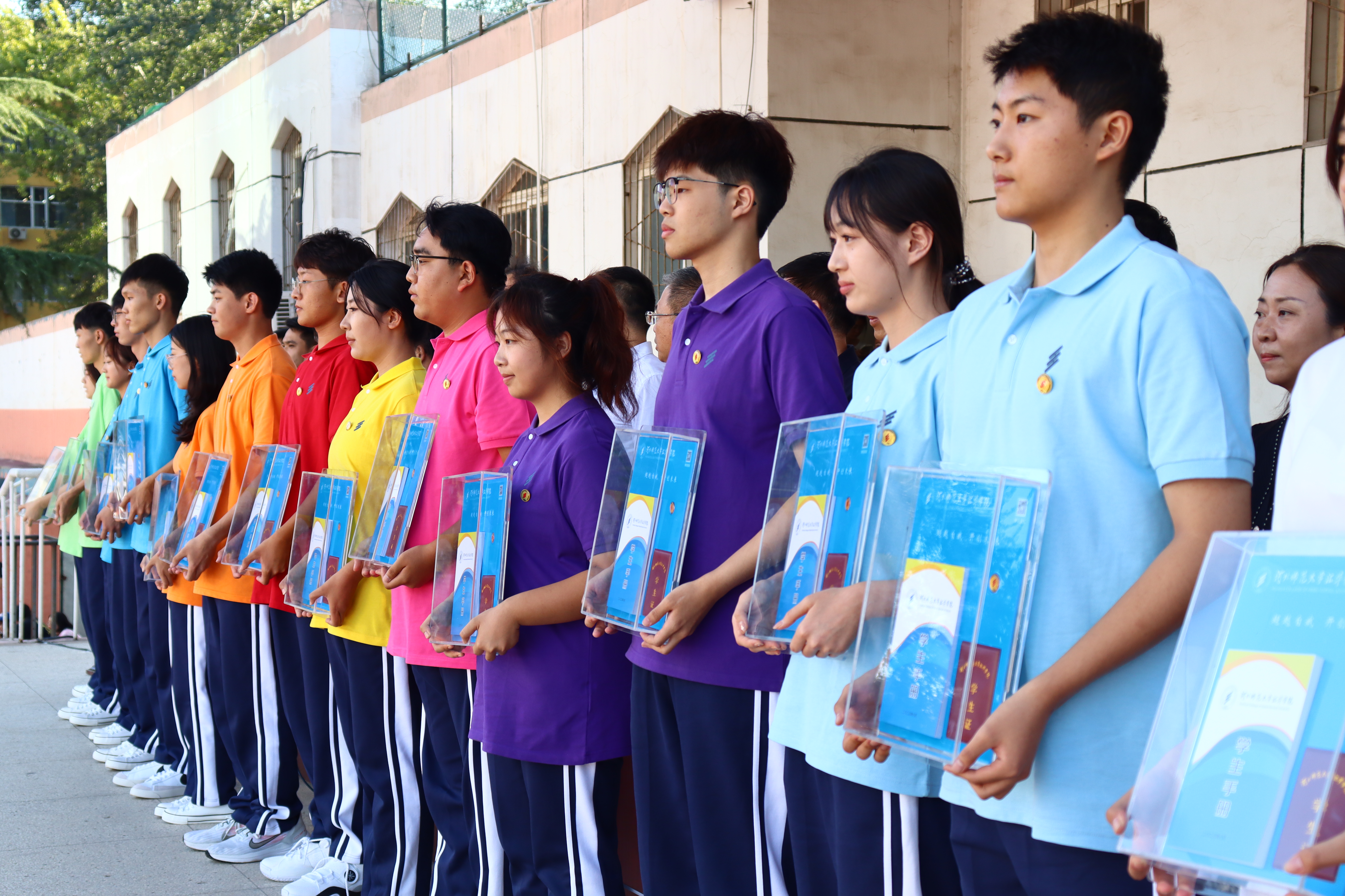 在开学典礼上,领导、老师为新生代表颁发了校徽和学生证,2023级新生正式加入了汇华大家庭。