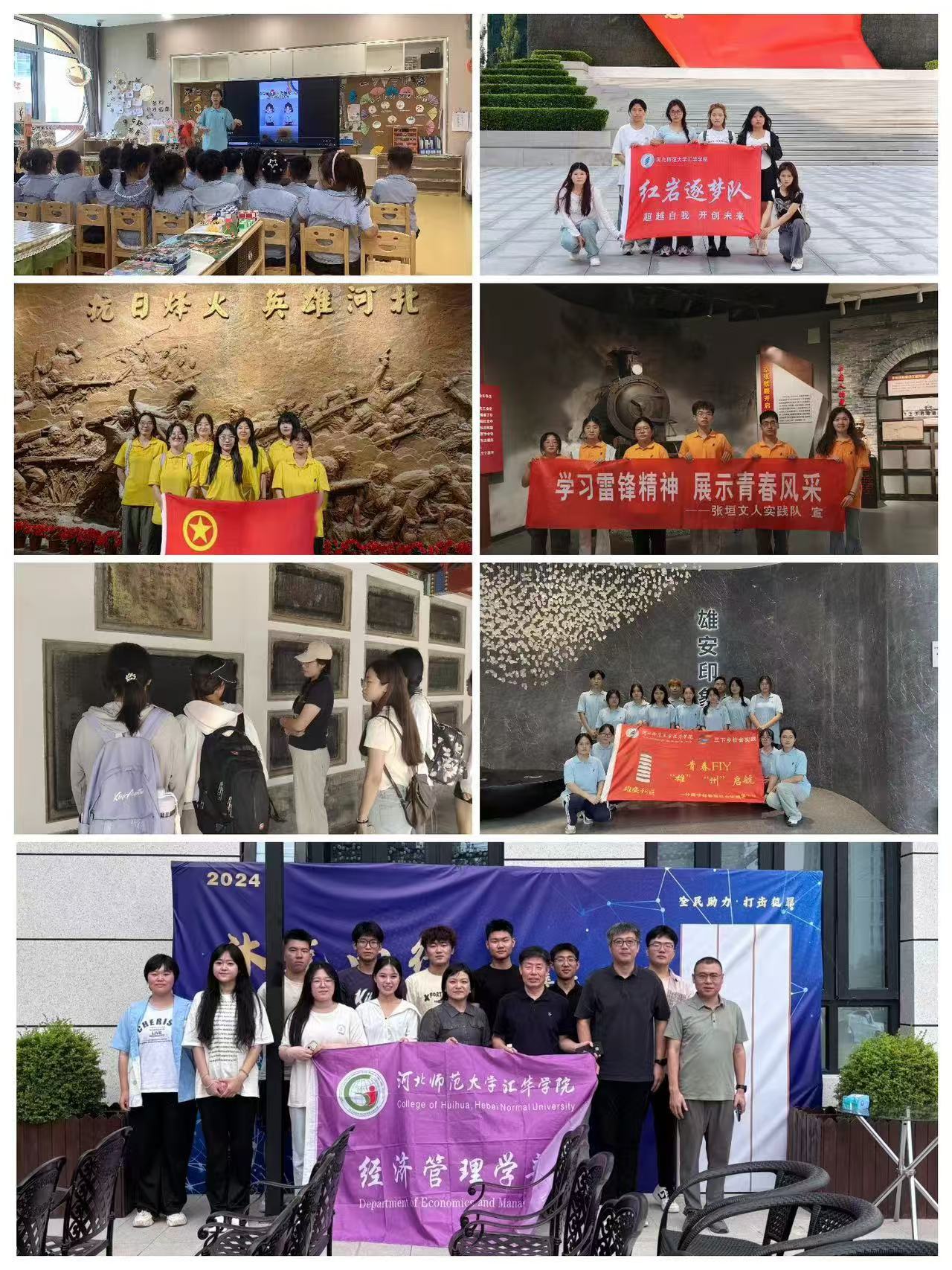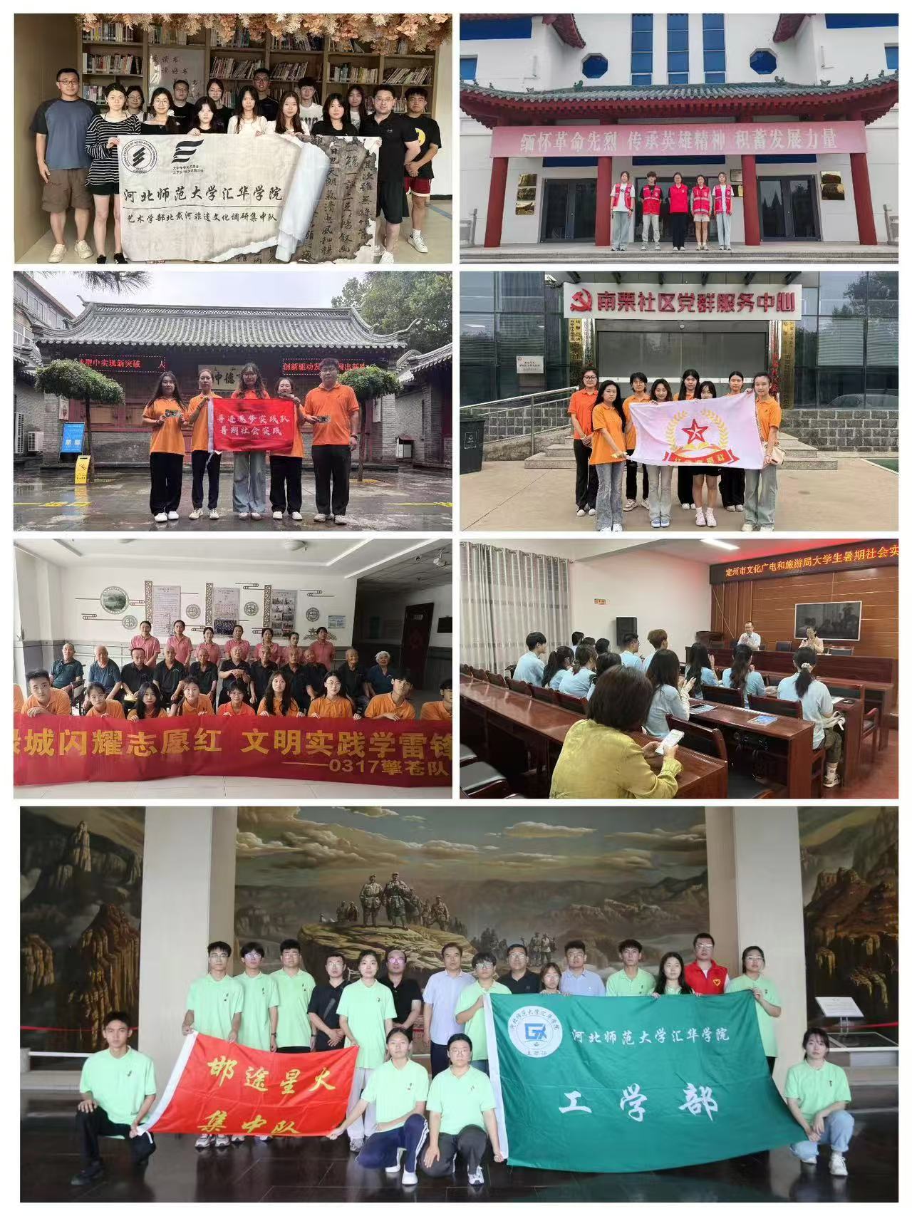 工学部“邯途星火”集中实践队,赴邯郸市涉县红色文化中心、烈士陵园、地道战遗址等多处红色文化圣地进行义务讲解,学习先辈峥嵘岁月,宣传冀南红色记忆;理学部“亮出乡村振兴精气神”同乡实践队利用数据分析助力乡村建设,精准施策,促进乡村振兴;文学部“红星耀燕赵”同乡实践队通过“学习-研讨-实践”三个环节,深刻领悟中国共产党百年奋斗的光辉历程和伟大成就;传媒学部“古韵邯郸”集中实践队,赴邯郸市探寻杨式太极、皮影等非物质文化遗产,用制作、推广纪录片的形式进行非物质文化遗产宣传活动;教育法政学部“乡振同心,民团同梦”同乡实践队先后赴邯郸市三陵乡、南吕固乡等多地实地观摩学习,深入探寻乡村振兴与民族团结的内在之道;经济管理学部“沐光而行”集中实践队深入石家庄市桥西区红旗街道各社区,与红旗派出所民警、社区工作者共同谋划开展普法宣讲、问卷调查、互动活动、移动剧场展演等丰富多彩的反电信诈骗主题活动,共筑安全防线;外语学部“青春fly,‘雄’‘州’起航”集中实践队赴定州就定州博物馆、贡院、开元寺塔等景点开展70余场志愿讲解服务,为促进定州的文化旅游贡献了青春力量;艺术学部北戴河非遗文化调研集中实践队赴秦皇岛市,对“锦灰堆”非物质文化遗产展开深入体验与调研,制作了系列文化衍生品,绘制水彩、国画、书法、团扇等作品90余件,并根据纹样设计制作了手机壳、帆布包、鼠标垫、抱枕等文创产品15种,设计出IP角色形象8个。