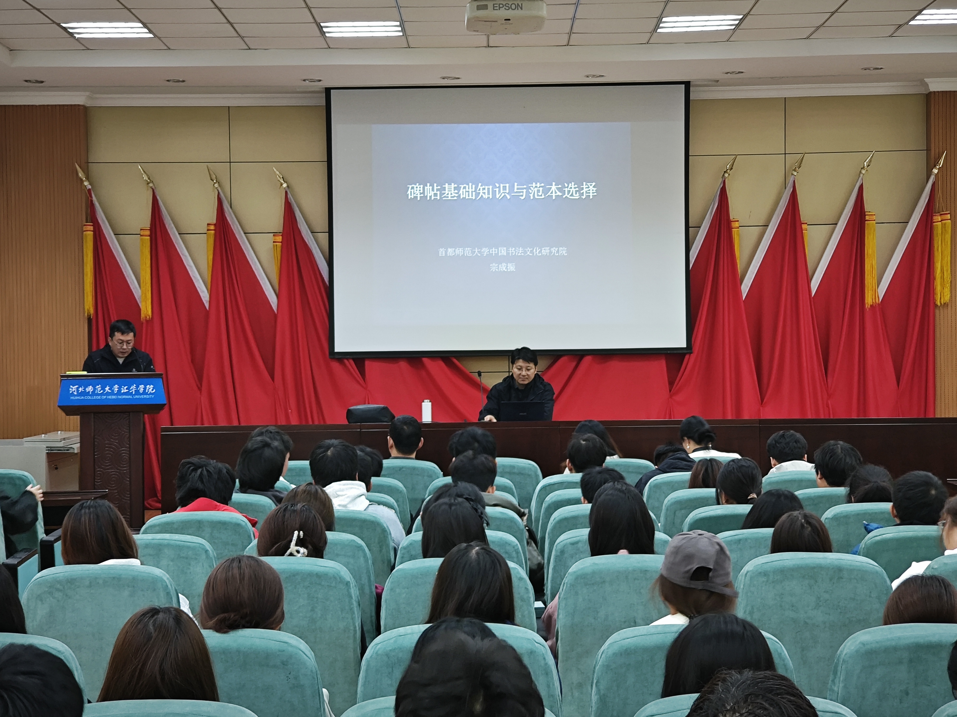 10月25日上午,首都师范大学中国书法文化研究院宗成振教授做客“汇华名家讲堂”,在图书馆一楼报告厅为Beat365师生作题为“碑帖基础知识与范本选择”的学术报告。艺术学部部长秦笑笑、副部长及部分教师出席活动。
