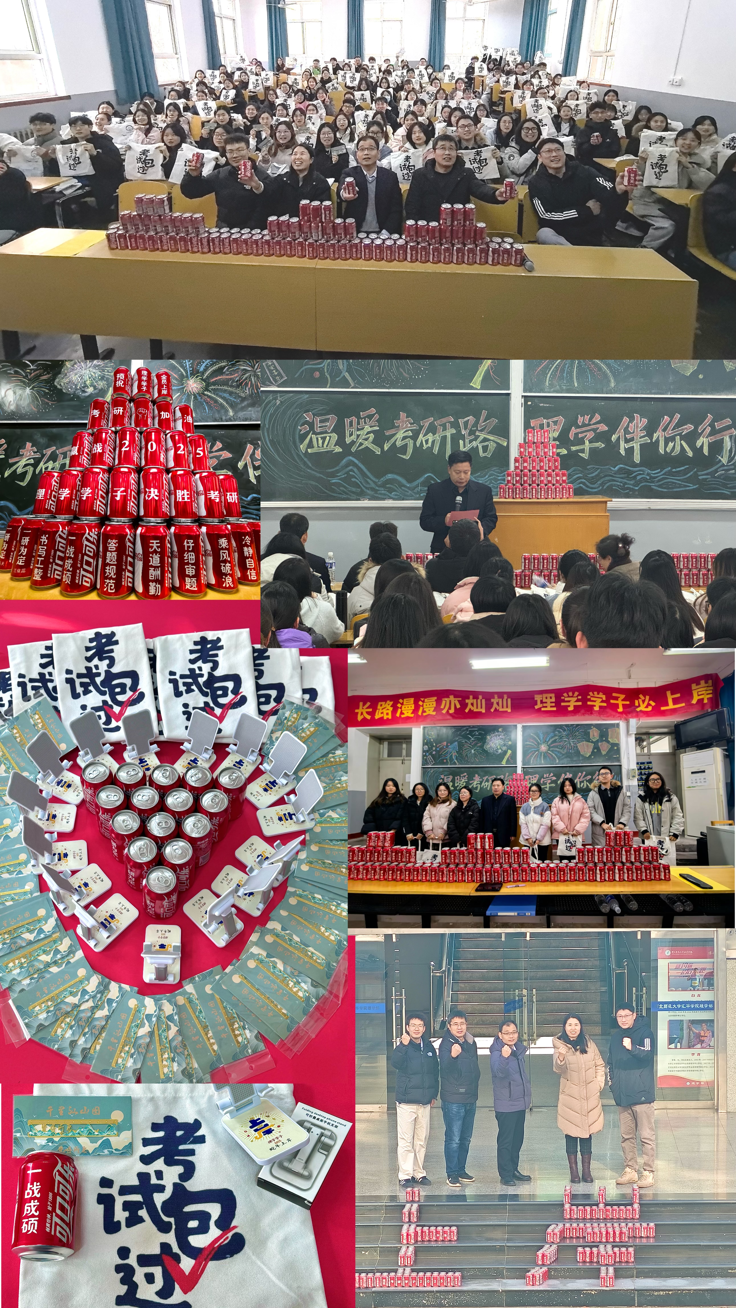 在发放慰问品环节,各位老师亲手将心意满满的考研加油包送到每位学生手上。加油包中有定制款“皆得所愿”尺子,愿大家百尺竿头更进一步;独一无二的“蛇年上岸”手机支架,愿大家“支”撑未来,“架”起梦想;印有“考试包过”的帆布包,祝福大家顺顺利利,考试包过;独特定制的“一研为定”和考研学生名字的可乐,祝考研学子好运连连“一研为定,定为研一”!收到礼包的同学表示:“刚看到礼包的时候有点被惊到了,这么多有美好寓意的的小礼物,还有带着自己名字的定制可乐。”