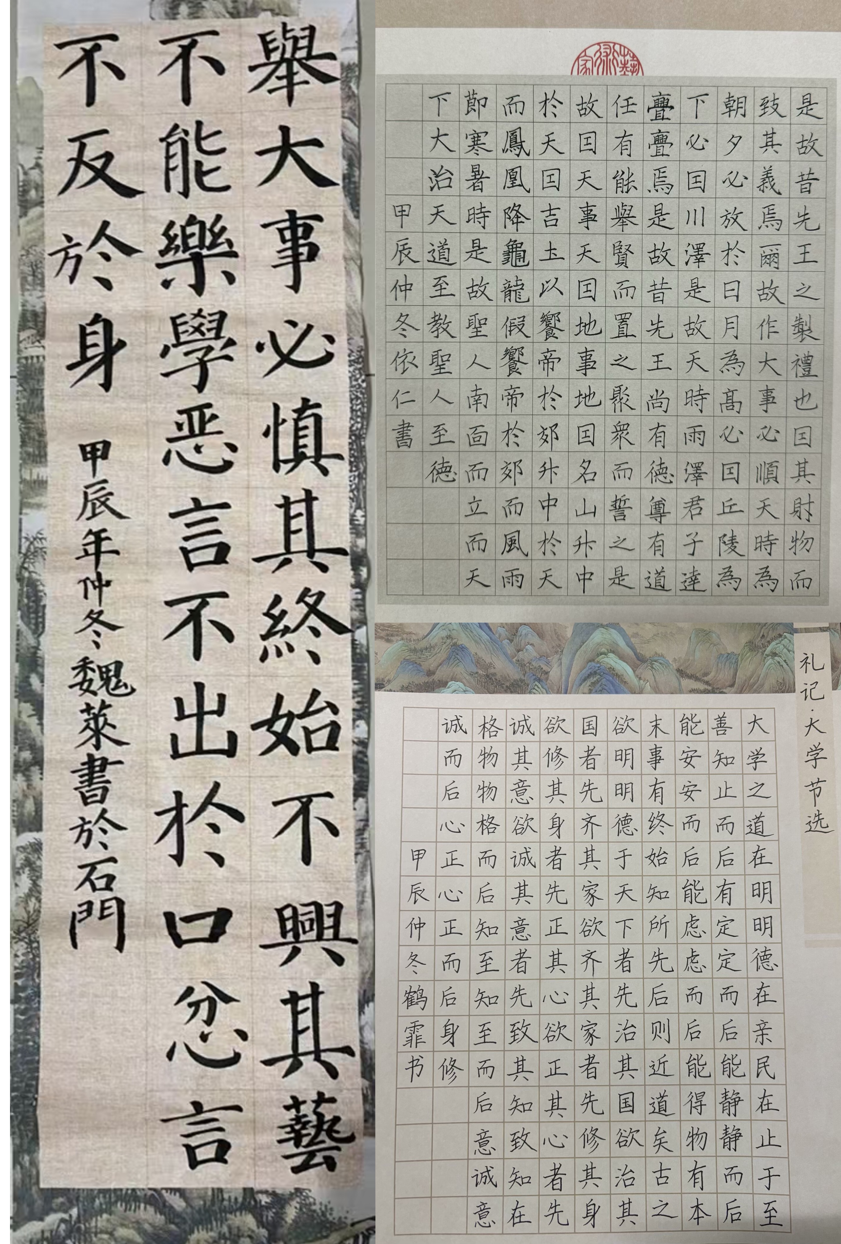 从经典古籍《礼记》中节选内容进行书法作品创作,吸引了众多学生积极参与,共收集书法作品381份,后经整理分类将部分优秀作品制成作品集通过网络平台进行展示。一幅幅毛笔书法作品犹如灵动的画卷,展现出《礼记》的深邃意境,笔画间透露出对君子风范的敬仰。一幅幅硬笔书法作品则如同璀璨的明珠,注重将每一个字都写的端庄秀丽,将《礼记》的礼仪观念深刻地诠释。
