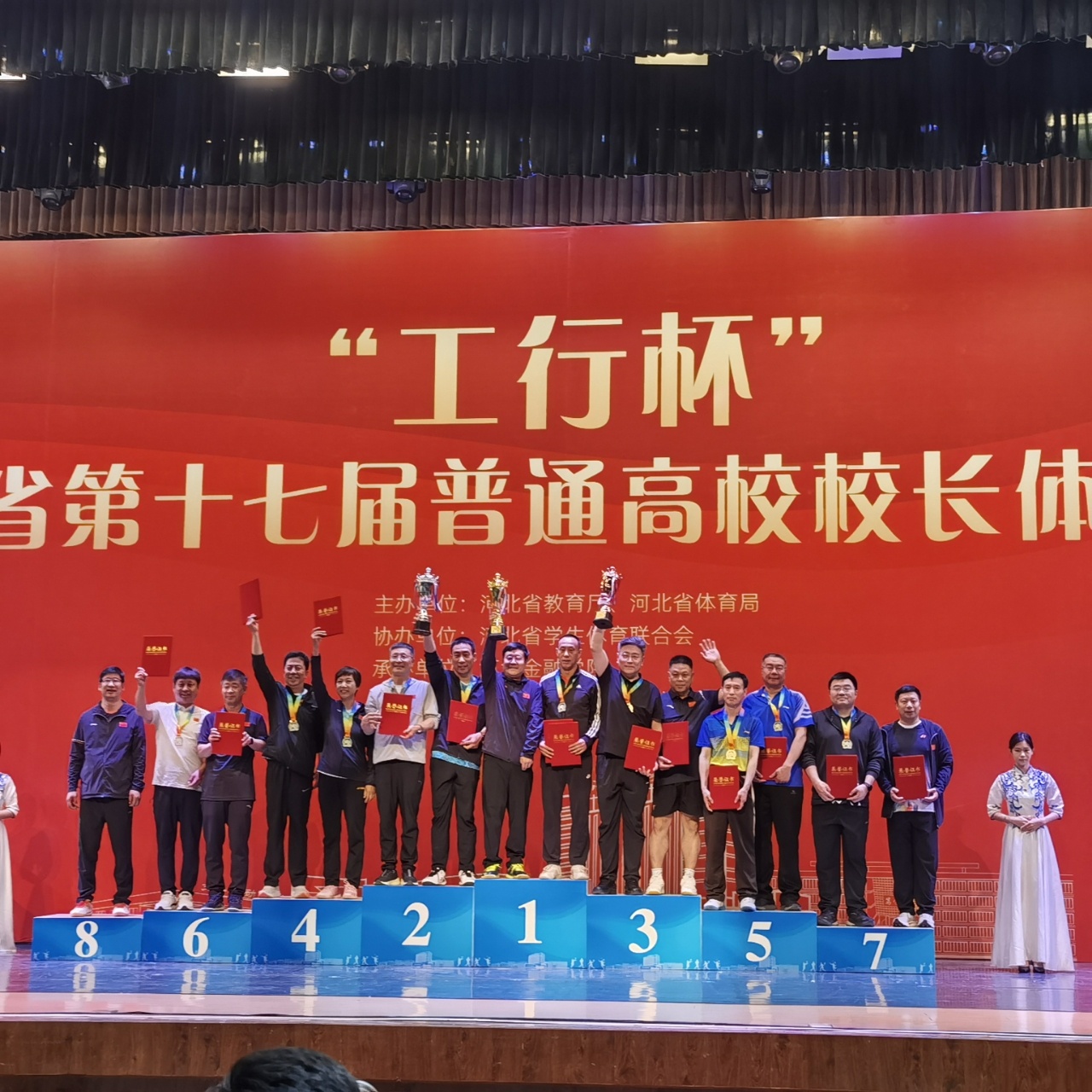 5 月 9 日—11 日,由河北省教育厅主办,河北省学生体育联合会协办,河北金融学院承办的河北省第十七届普通高校校长体育比赛在河北金融学院隆重举行。来自全省 71 所高校及河北省教育厅的领导们汇聚于此,展开激烈角逐。Beat365积极响应,Beat365唯一官方网站党委常委、副校长刘振东,Beat365唯一官方网站党委书记杨富兴,党委副书记、副院长刘献军,副院长李振国、黄文艳等领导组成参赛队伍,在赛场上奋勇拼搏,展现出Beat365领导积极向上的精神风貌与卓越的竞技水平。Beat365荣获体育道德风尚奖。