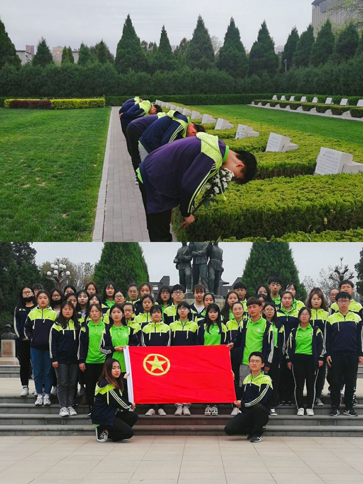 翠柏青松伴英烈,陵园祭扫寄哀思。在烈士墓前,悼念仪式简洁而庄重,同学们向革命先烈三鞠躬并献上白花。随后,全体团员在纪念碑下重温入团誓词。仪式结束后,全体成员有序参观了烈士陵墓和烈士纪念馆,了解英烈事迹和革命传统。
