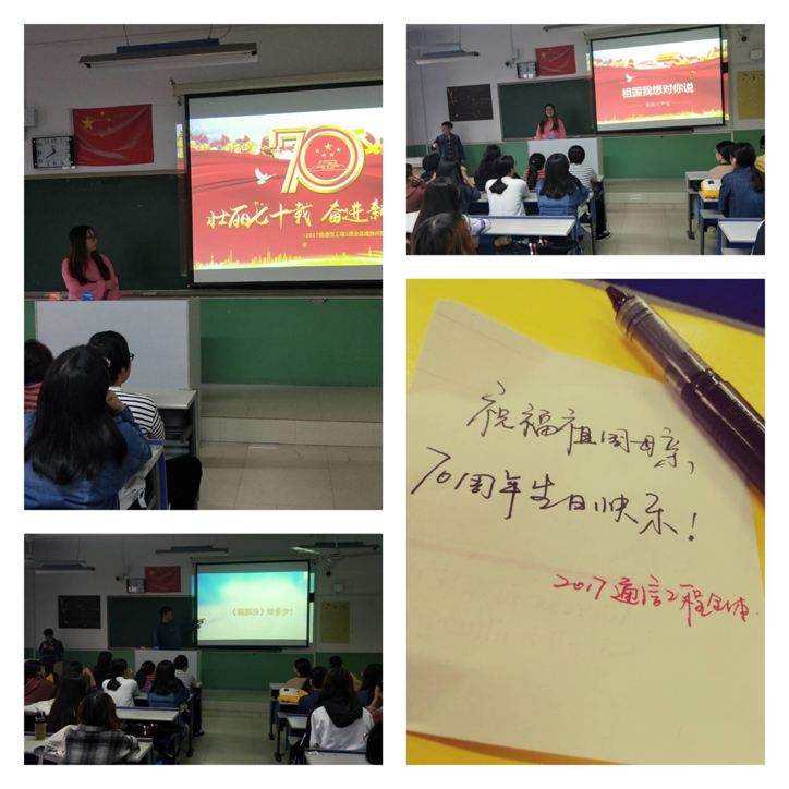 为庆祝新中国成立70周年,增强同学们的爱国主义情怀,提升班级的向心力和凝聚力,2017级通信工程1班开展了“壮丽七十载,奋进新时代”主题系列活动。